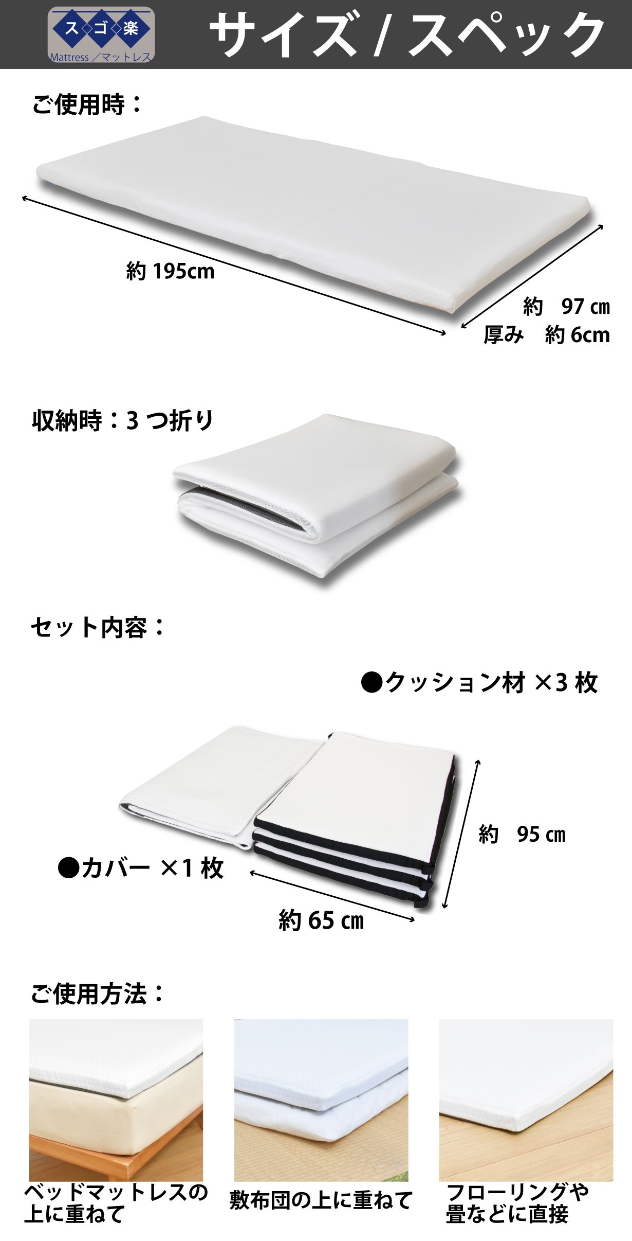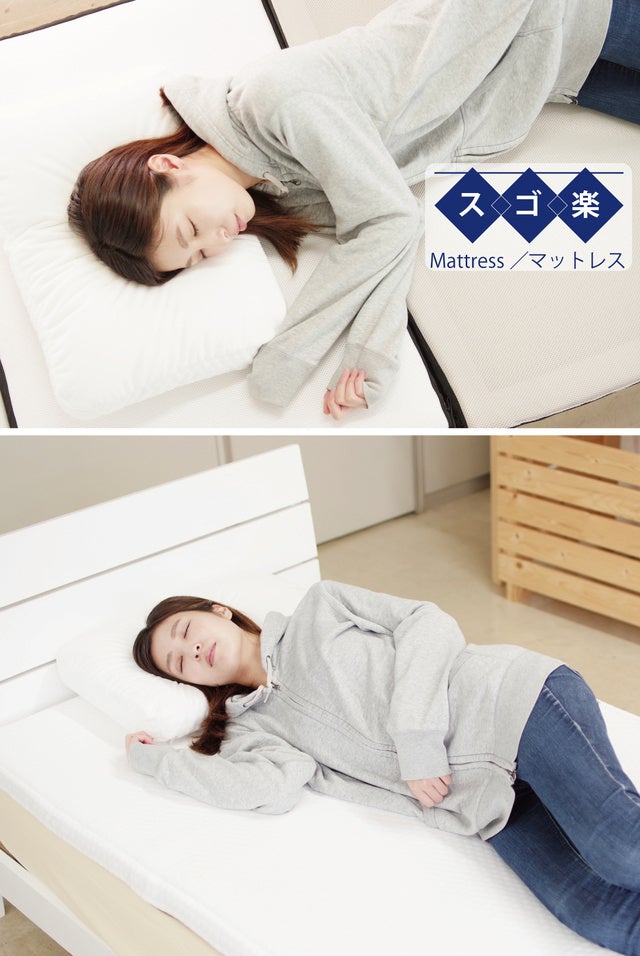 【スゴ楽】マットレスは、ハードエアーラッセルとソフトエアーラッセルの組み合わせで構成されています。ホワイト面はソフトな感触で心地よく、グレー面はしっかりと身体を支えます。沈み込みすぎない構造は、腰への負担も軽減します。