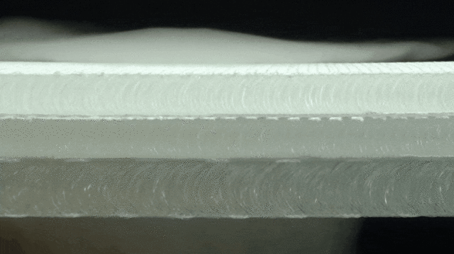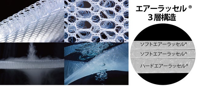 当社独自のクッション材の『エアーラッセル』は、強力なポリエステル糸で立体的に編み立てられています。マットレスなどのクッション材として、約15年以上の生産実績のある素材です。