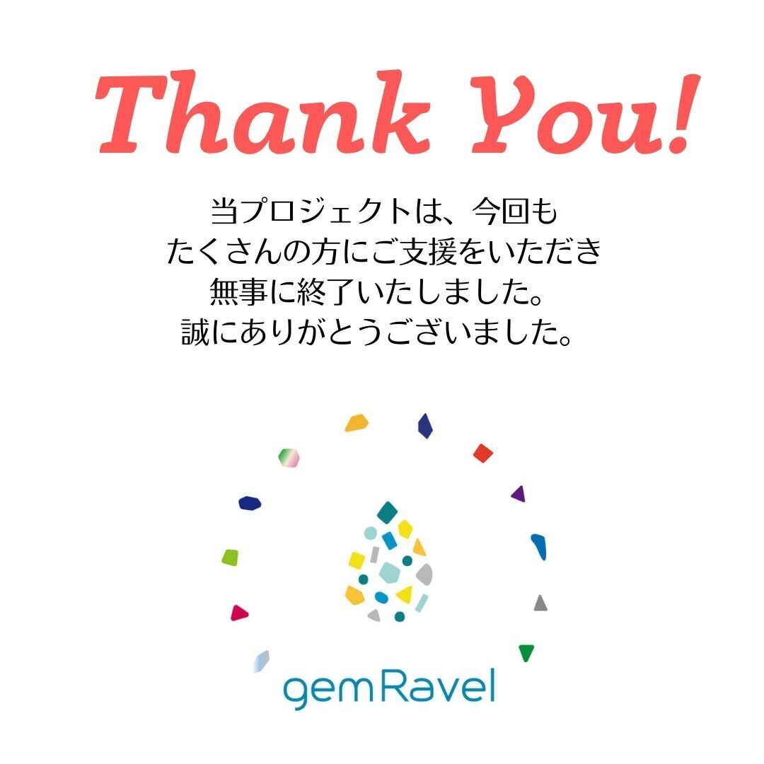 2021/10/29 16:41ご支援者の皆さま昨日当プロジェクトは目標を大きく上回るご支援をいただき無事に終了致しました。終了間際まで多くの皆様のご支援を頂けたことを非常に嬉しく思っております。誠にありがとうございました。心より感謝申し上げます。また新作の企画・製作及び一般販売に向けての準備もおこなっております!!-----------------------------◆リターン品の発送について◆ご支援者の皆さまへのリターン品の発送はすでに開始しておりますのですでにお届け済のご支援者様もいらっしゃるかと思います。是非お受け取りをお願い申し上げます。配送会社は一律「ヤマト運輸」にておこなっております。予想を大きく上回るご支援を頂いたため、お届けまで数日いただきますが、万全の態勢で梱包・発送をおこなっておりますので、1週間~10日以内にはすべてのご支援者さまにお届けできる予定です。発送の順番は順不同でおこなっておりますので、ご支援日時に関わらず順番が前後する場合がございますので、ご了承くださいませ。-----------------------------ご支援の皆さま、この度は本当に本当にありがとうございました。-----------------------------最後にこのプロジェクトに関わっていただいたデザイナーさん、カメラマンさん、アシスタントさん、製作担当の皆さま、運送会社の皆さま、多大なるご尽力をいただき、心より感謝申し上げます!!gemRavel もっと見る