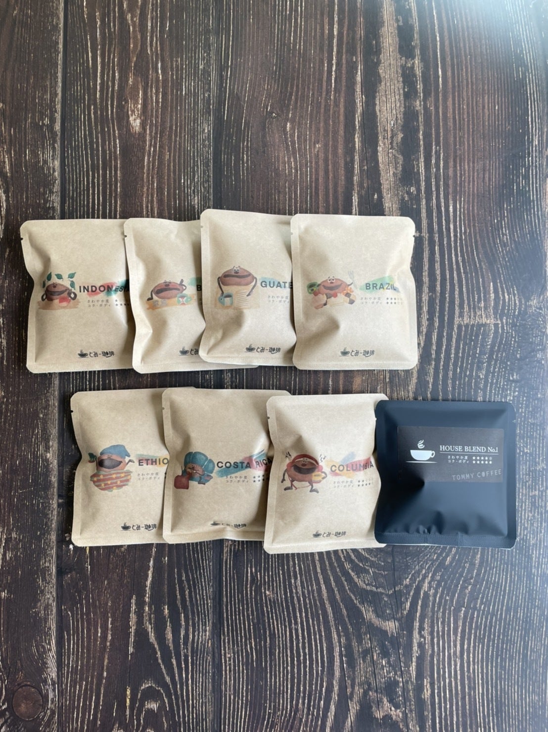 内容:エチオピア(朝目覚めのお供に)×2+ブルンジ(二日酔いのお供に)×2+ブラジル(デザートの共に)×2+コスタリカ(映画鑑賞のお供に)×2+グアテマラ(仕事、勉強のお供に)×2+コロンビア(音楽のお供に)×2+インドネシア(リラックスのお供に)×2+クラウドファンディングブレンド×2