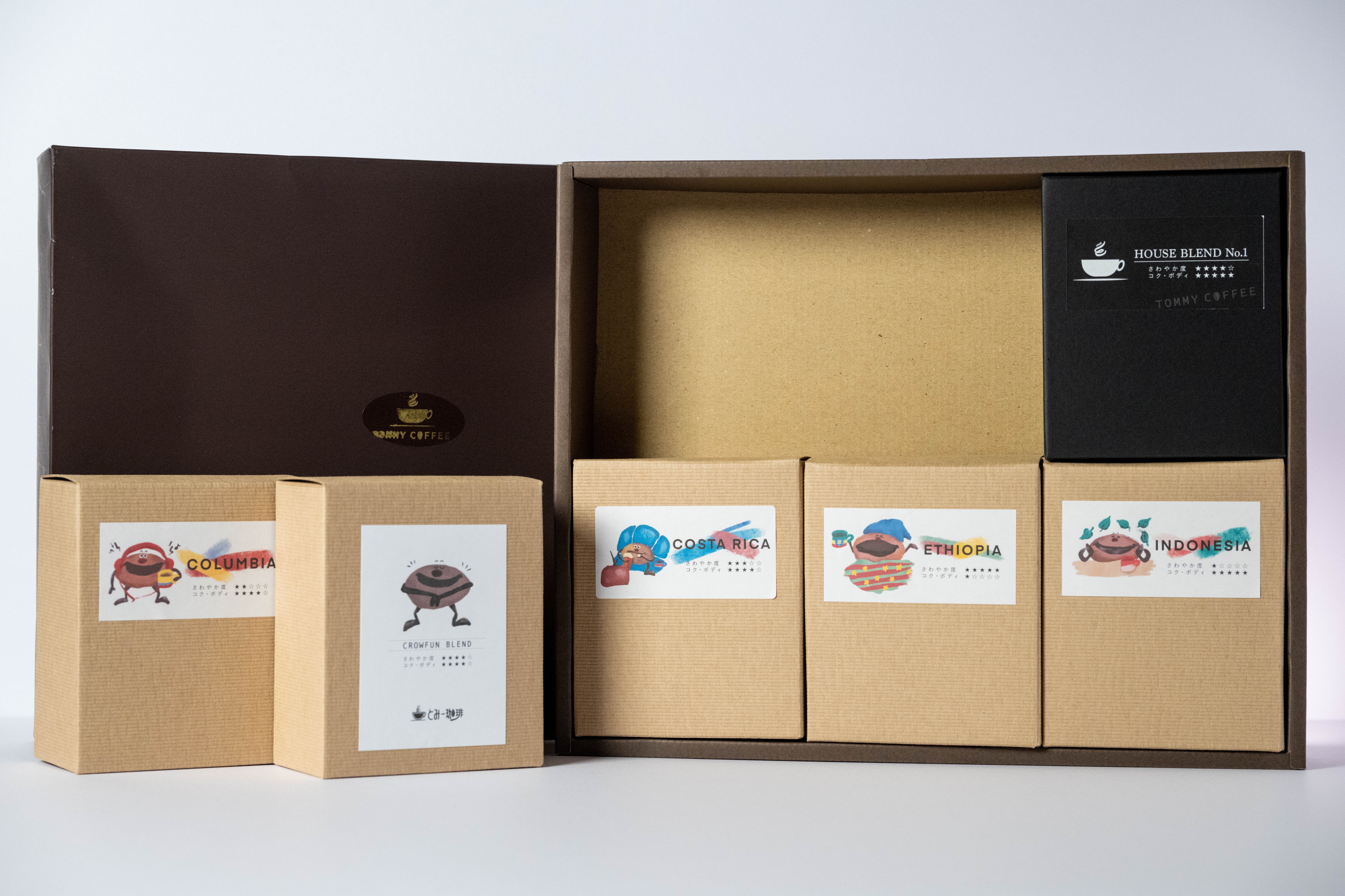 内容:ハウスブレンド、クラウドファンディングブレンド、エチオピア、ブラジル、インドネシア 各1パック