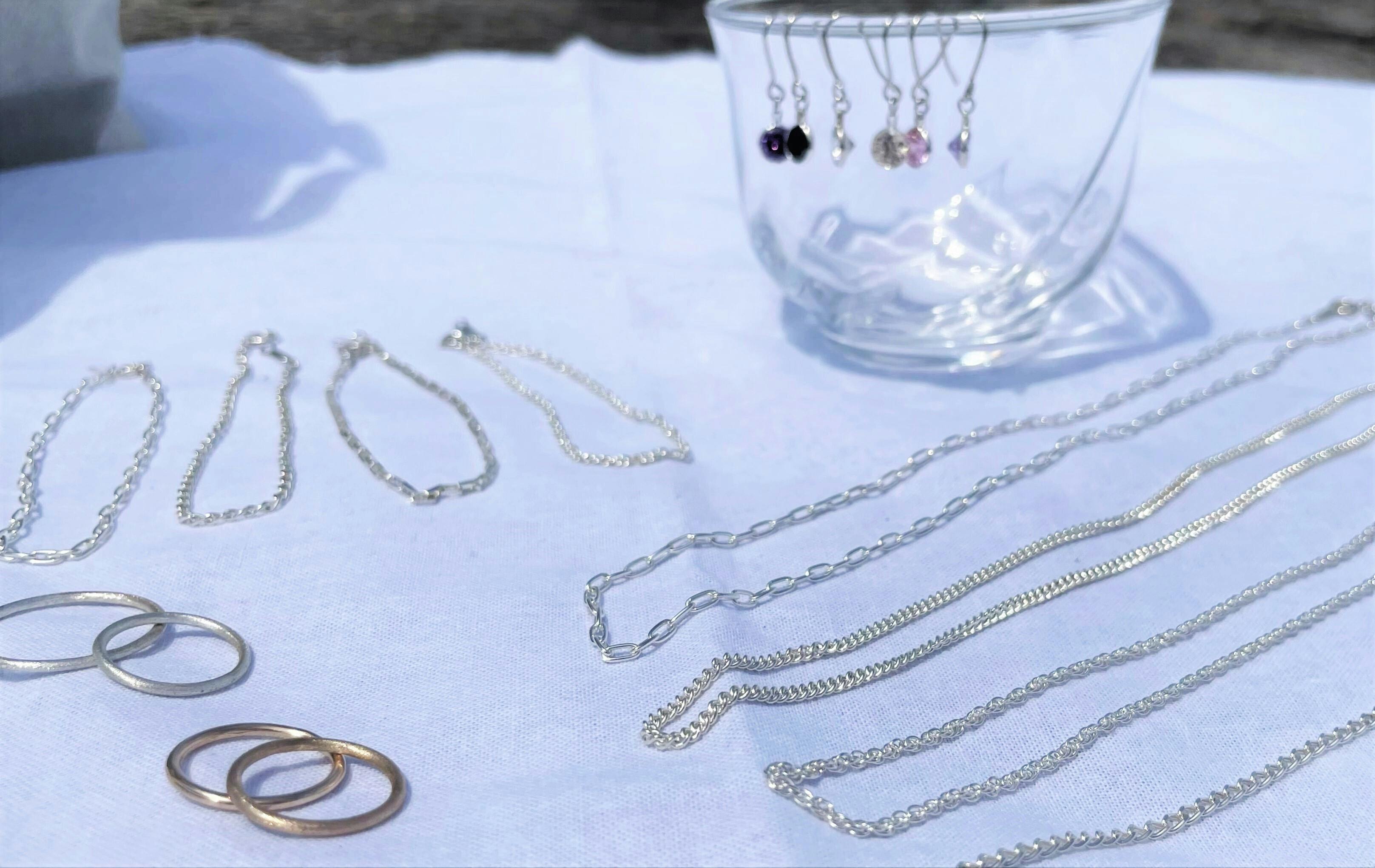 季節や服装を問わないシンプルなチェーンブレスやネックレスの他、