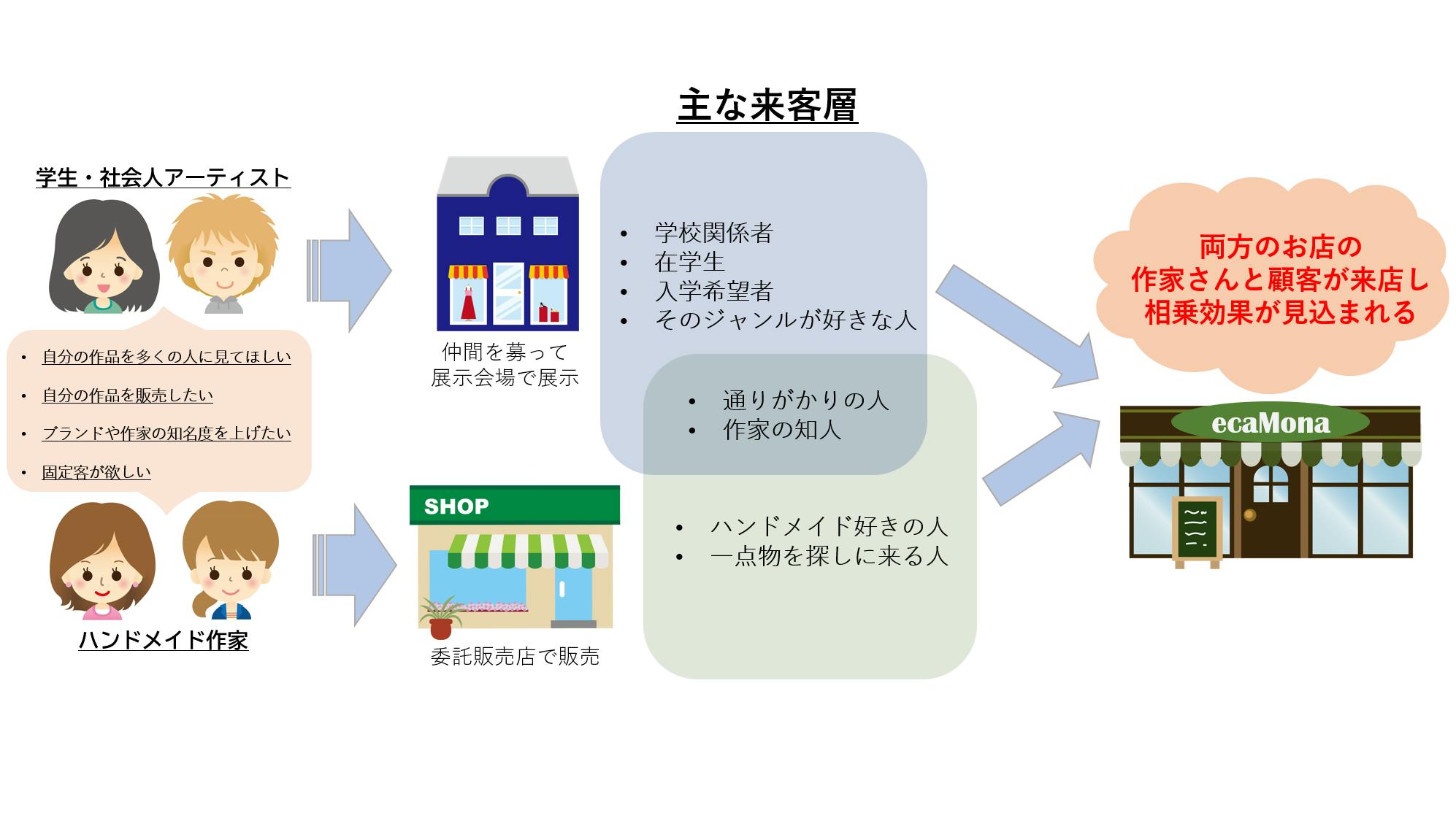 ②展示会場と委託販売店という異なる業種を融合させることによる来客層の増加が期待できる。(図参照)