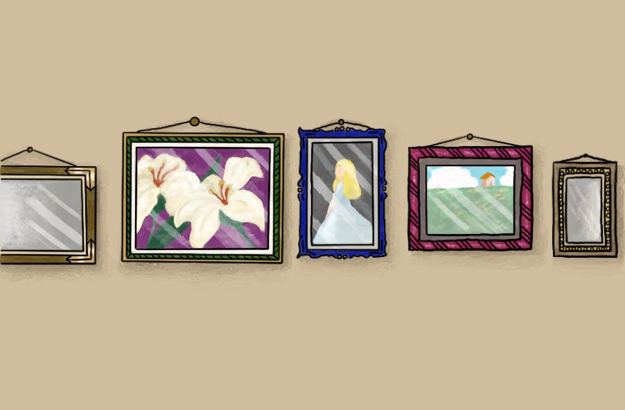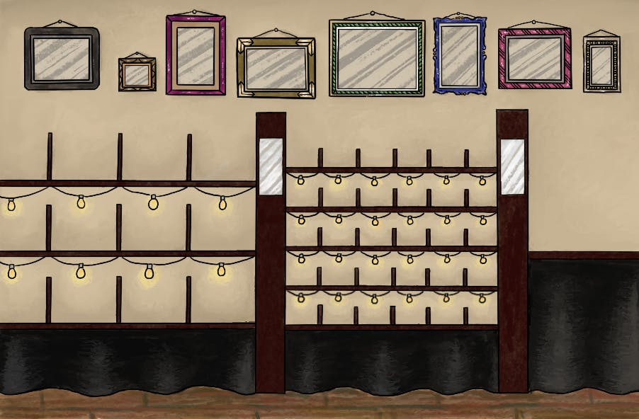棚の上部の空いたスペースに形、大きさ、カラーなど様々な額縁を配置します。
