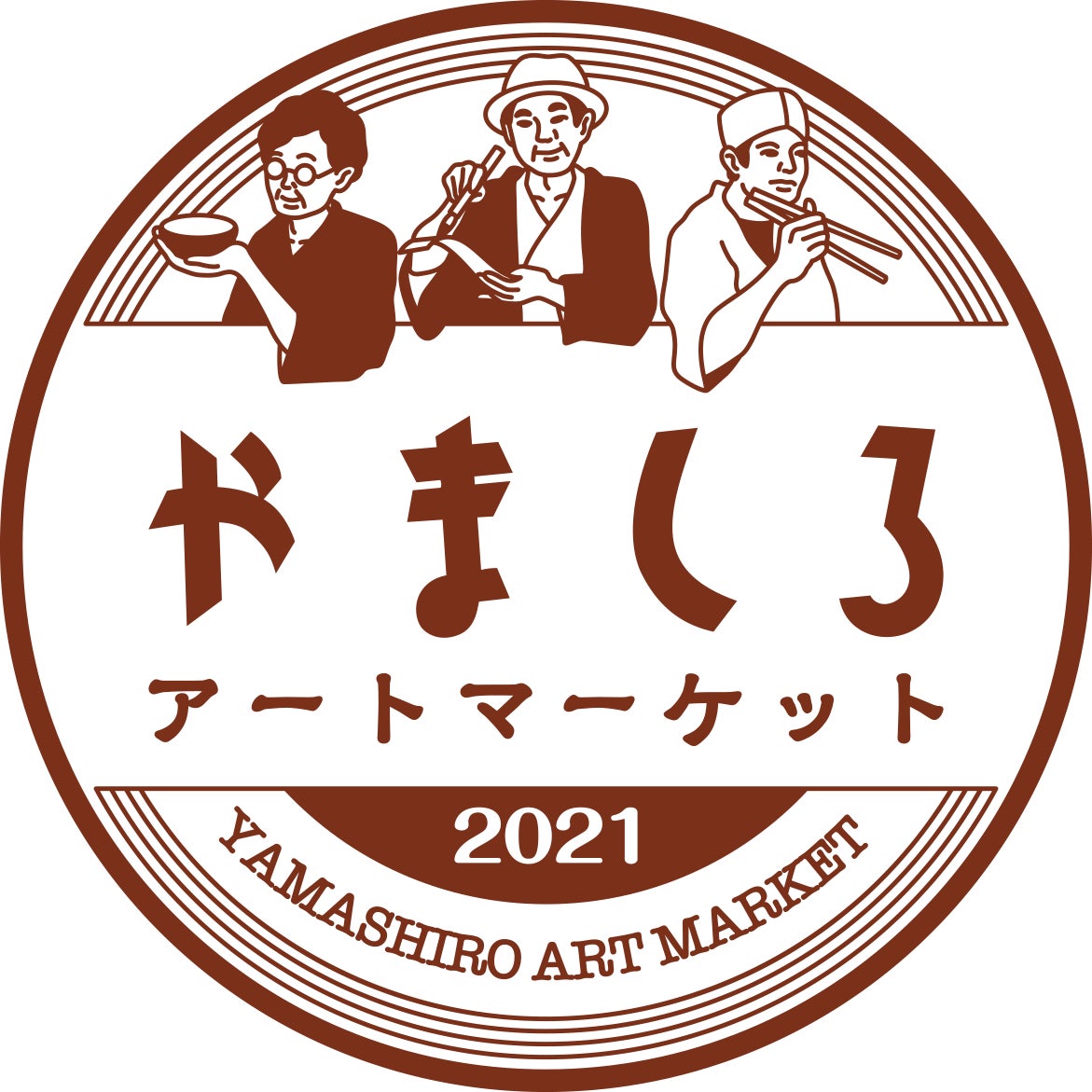 ロゴタイプは平野甲賀氏のフォントを採用し、旦那衆のイラストは左から「クラフト」「アート」「食」をイメージして描いていただきました。やましろアートマーケットが「北大路魯山人の才能を見出して支援した旦那衆のような存在になれるように」という願いを込めたロゴマークです。