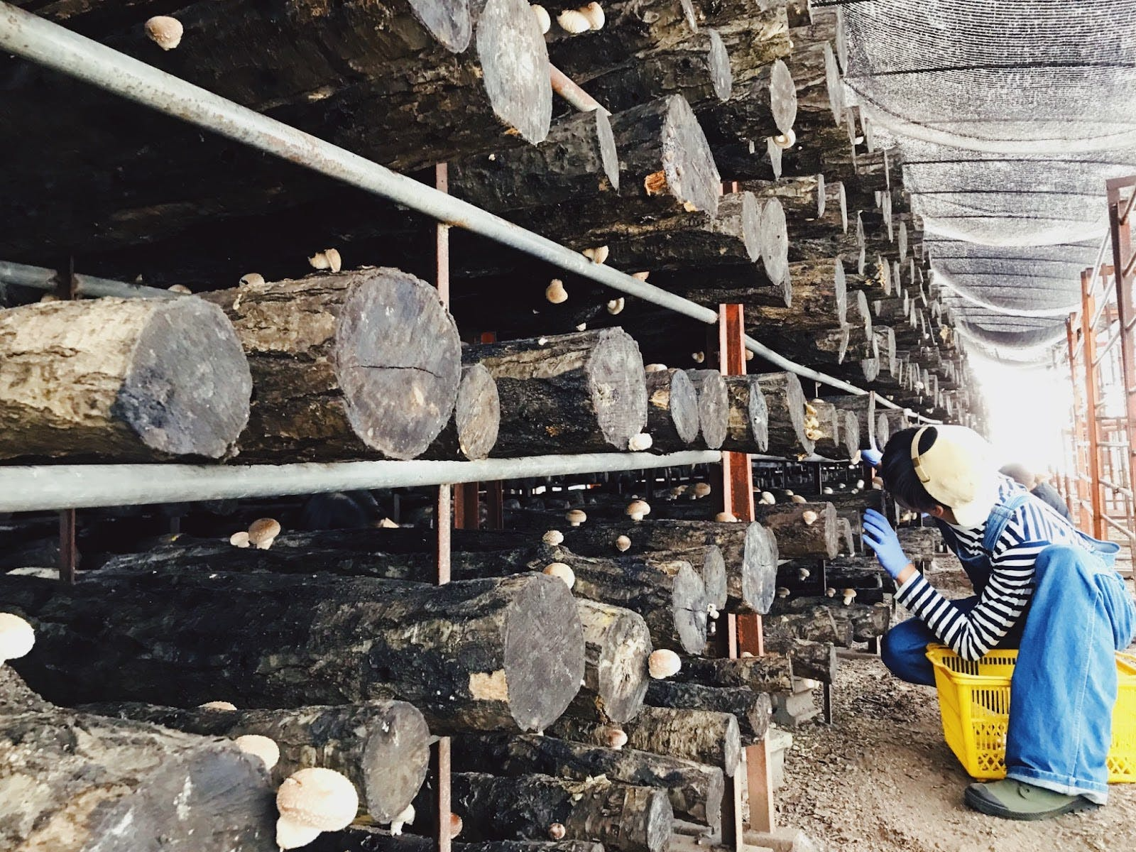 たのしいたけを育てることは、とてもとてもたのしいです。もちろん、大変なこともたくさんあります。何百本もの原木を水に浸し、眠っていたしいたけ菌を起こす。出てきたしいたけを収穫する、また休ませる、を手作業で繰り返す日々。暑くないか、寒くはないか、乾燥していないか、困ったことはないか、たのしく育っているか、いつもいつも気にかけ見守っています。だからこそ、ポコンと顔を出したときの喜びは例えようがありません。「よく出てきたね、かわいいね、おいしそうだね」と何度も話しかけてしまいます。たのしいたけとの毎日は、私たちに命を生産することの喜びを教えてくれるものです。