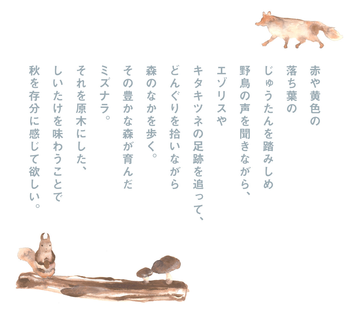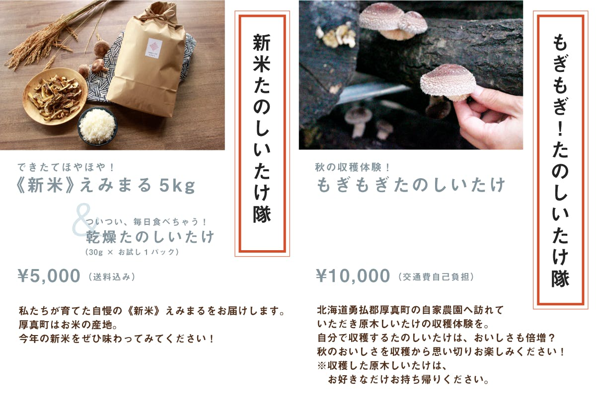 厚真町は北海道胆振東部地震による被害で復興の途中にあります。町の住民ももちろんですが、広大な厚真の森林が深く傷ついています。皆さんには、たのしいたけをおいしく味わうなかで、かつての姿を取り戻そうと力強く生きる森の息吹を感じていただきたい。そして、おいしく食べることで幸せを感じ、嬉しさと楽しさも味わっていただきたい。それが森を護ることにつながると信じています。