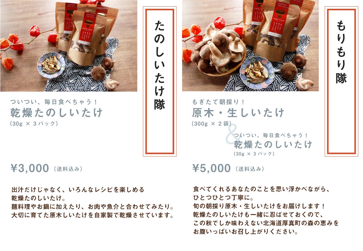 厚真町は北海道胆振東部地震による被害で復興の途中にあります。町の住民ももちろんですが、広大な厚真の森林が深く傷ついています。皆さんには、たのしいたけをおいしく味わうなかで、かつての姿を取り戻そうと力強く生きる森の息吹を感じていただきたい。そして、おいしく食べることで幸せを感じ、嬉しさと楽しさも味わっていただきたい。それが森を護ることにつながると信じています。