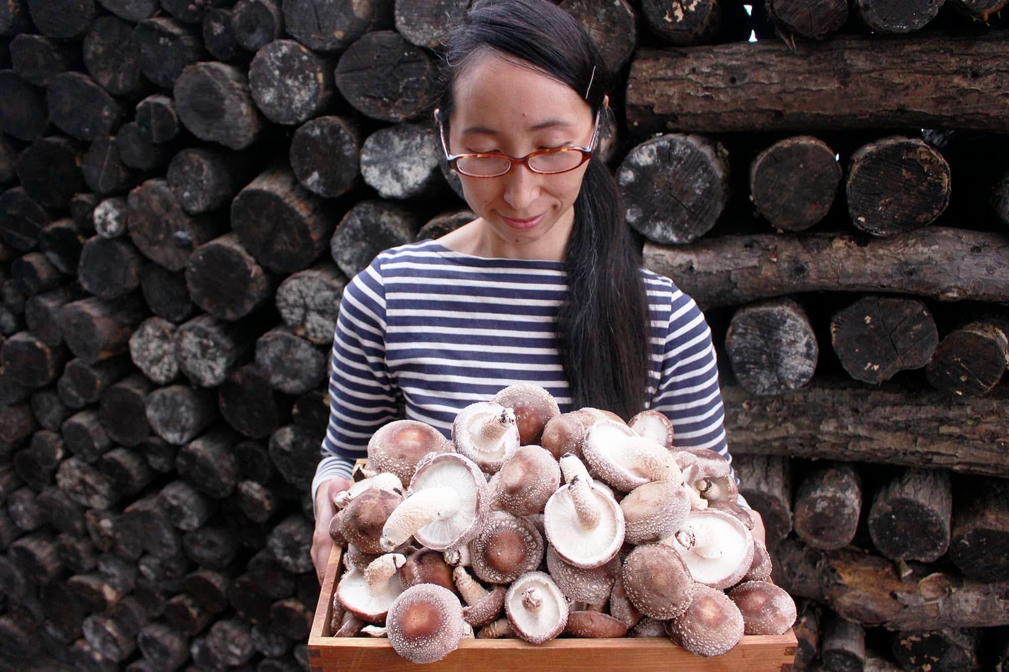 たのしいたけを育てることは、とてもとてもたのしいです。もちろん、大変なこともたくさんあります。何百本もの原木を水に浸し、眠っていたしいたけ菌を起こす。出てきたしいたけを収穫する、また休ませる、を手作業で繰り返す日々。暑くないか、寒くはないか、乾燥していないか、困ったことはないか、たのしく育っているか、いつもいつも気にかけ見守っています。だからこそ、ポコンと顔を出したときの喜びは例えようがありません。「よく出てきたね、かわいいね、おいしそうだね」と何度も話しかけてしまいます。たのしいたけとの毎日は、私たちに命を生産することの喜びを教えてくれるものです。