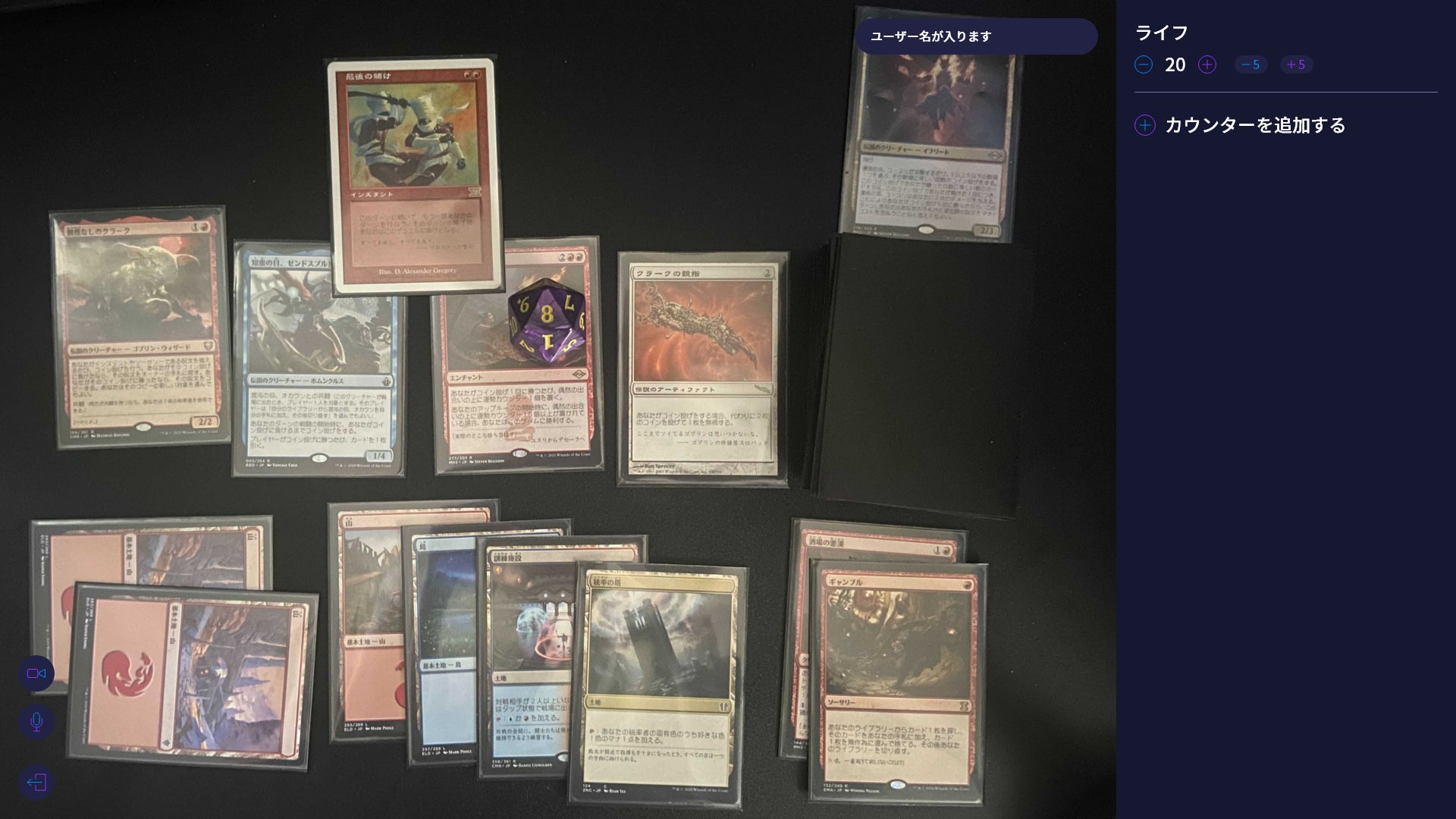 ゲーム画面では、カウンターの設定ができる他、ダイスやコインを投げることもできます。