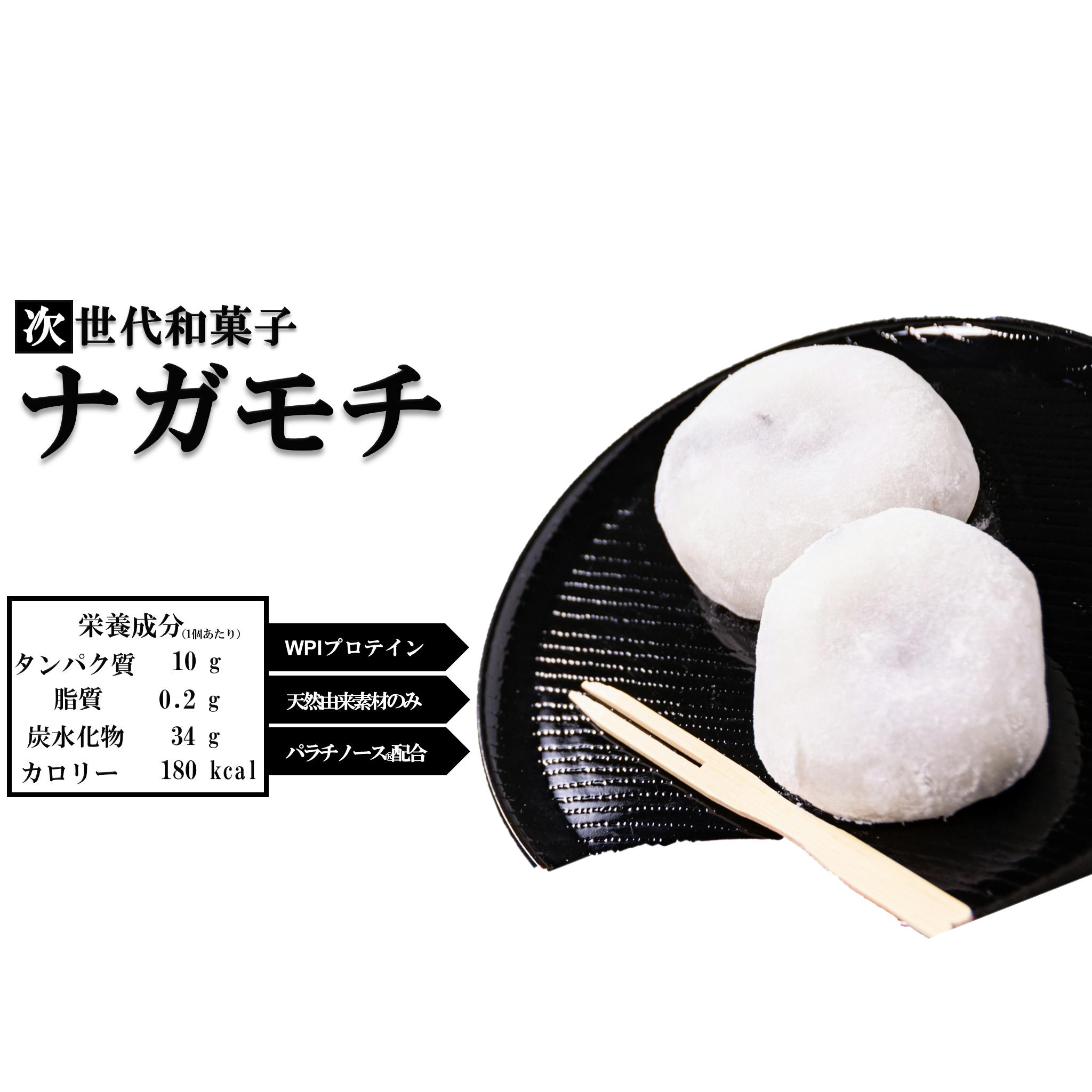 「ナガモチ」はスポーツ栄養学x和菓子を組み合わせ、アスリートに人気のパラチノース®と吸収時間の違う複合糖質にプラスしてBCAA等のアミノ酸を含むタンパク質を黄金比率で配合した栄養補給に最適な次世代の和菓子です。