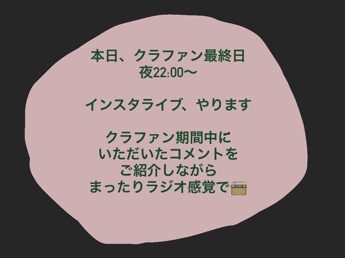 2021/10/24 14:47こんにちは、踊り場です。ついに最終日となりました!今日まで107名のご支援、本当にありがとうございます!皆様の温かいご支援を明日からは力に変えて、12月頭のオープンに向けて準備を進めて参ります。また、不定期な活動報告でしたが、クラウドファンディング初日から今日までお付き合いいただいた支援者の皆さま、ありがとうございました。今後は各種SNSを通して、SAN/踊り場の報告をしていきますので、今後も気にかけていただけると嬉しいです!Instagram:https://www.instagram.com/odoriba_furumachi/Twitter:https://twitter.com/odrb_furumachiまた、選んでいただいた返礼品は、順次発送・店頭受け取りの用意をしますが、時間のかかるものもございます。商品によっては「来年3月お届け」というのもありますので、どうか気長にお待ちください。。※食品を選んでいただいた方に改めてお知らせ。アレルギーや嫌いなものがある方は、必ず備考欄に記載くださいね!書き忘れたー!最近アレルギー発見したー!という方は、CAMPFIREメッセージにてご連絡ください。そしてそして、今晩22:00~からはこれまでいただいたコメントを紹介しながら、ゆるめのインスタライブをしようと思います!遅くまで起きていられる大人の皆さんは飲み物片手に、ぜひお視聴くださいませ◎今日まで、本当にありがとうございました!2021年12月オープン予定の、まちのちいさな複合施設SAN/文化商店 踊り場は、多くの人の思いを乗せて、いよいよ始まります。ぜひぜひ、楽しみに待っていてください^^ もっと見る