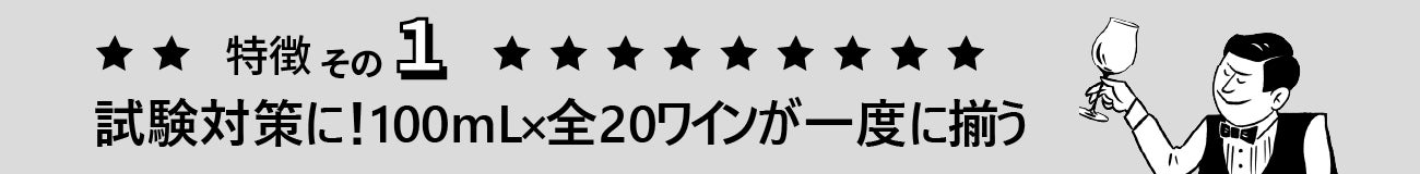 ▸ 試験頻出品種を中心に、多様な品種・産地をカバー。メジャー品種は産地違いでご用意。ワインはいずれも品種特性が明確に表現され、ソムリエ試験直前のトレーニングに便利です。