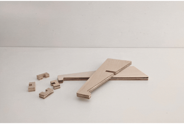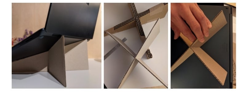 木を組み合わせて使う形状のテーブルからインスピレーションを得て、PCスタンドのデザイン案を作成。最初は段ボールで試作品を作り、サイズ感などを確認し微調整を行いました。