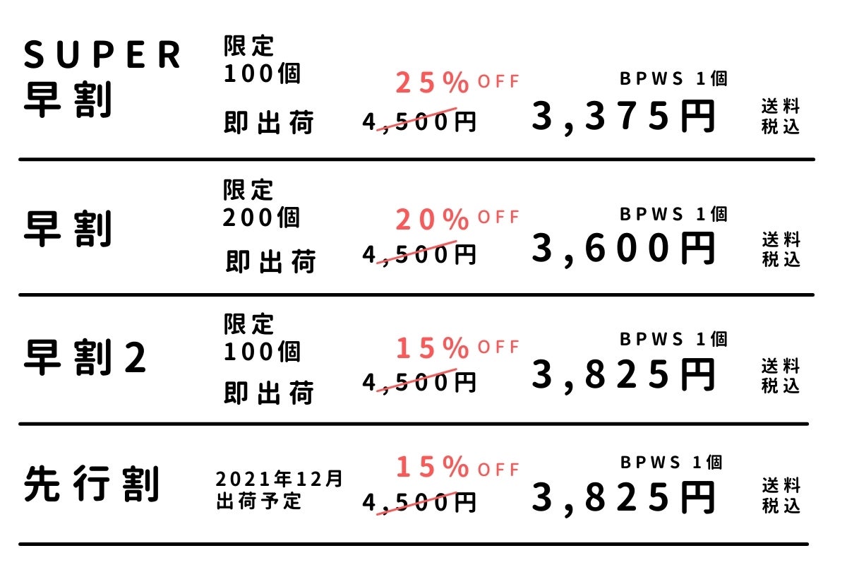 SUPER早割、早割、早割2:プロジェクト終了後、順次出荷(2021年10月上旬~中旬出荷予定)