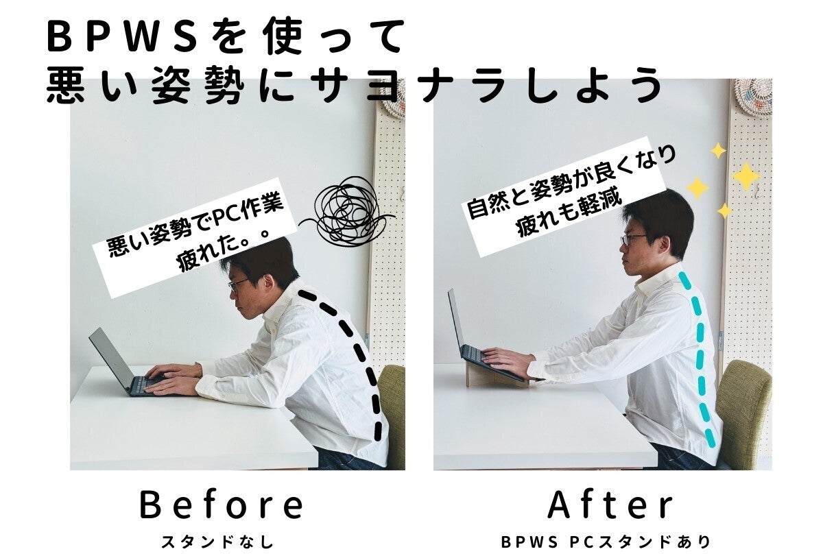 PCスタンド【BPWS】は、そんなPC作業時の姿勢をサポートし、首・肩・腰などの疲れを軽減し、毎日を快適にしてくれるアイテムです!