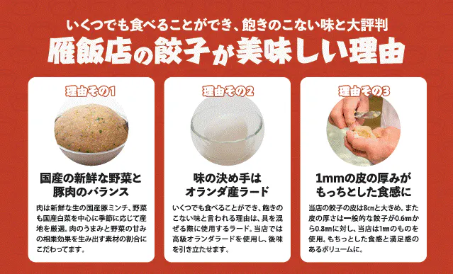 原材料名: 【餃子の具】白菜(国産)、キャベツ(国産)、豚肉(国産)、ラード(オランダ産)、 ニラ、にんにく、しょうが、 卵 、胡麻油、醤油、 食塩、胡椒、調味料(アミノ酸) 砂糖、トレハロース