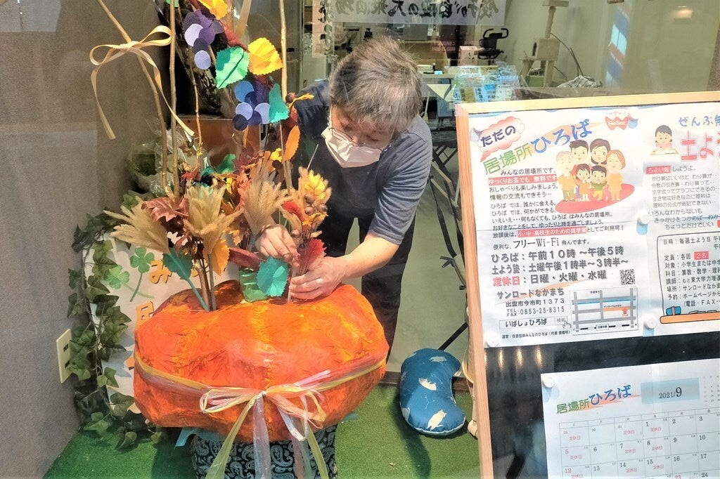 出雲市のサンロードなかまちは、駅近くの商店街。そのなかほどにある居場所ひろばは、かつては、洋品店だったようです。だから、ショーウインドウがあるんです。そこは、なかまのひとりの発表の場になっています。季節ごとに、春はタンポポ、夏は金魚、冬は雪だるま。そして、昨日、9月25日に飾り替えされて、巨大なカボチャを中心とした飾りになりました。上のほうを見ると、クリのいがもあるんです。この飾り付け、平日の午前中、お散歩する保育園の子どもたちにも大人気なんです。きっと、このカボチャを見たら、びっくりするでしょうね。どんなリアクションがあるか、今から楽しみです。