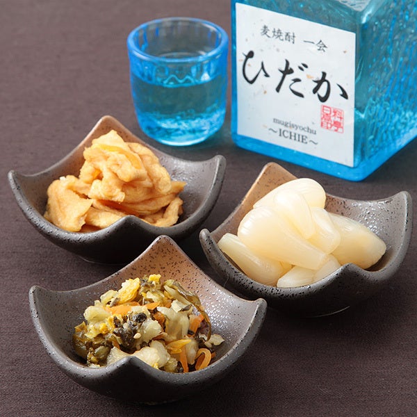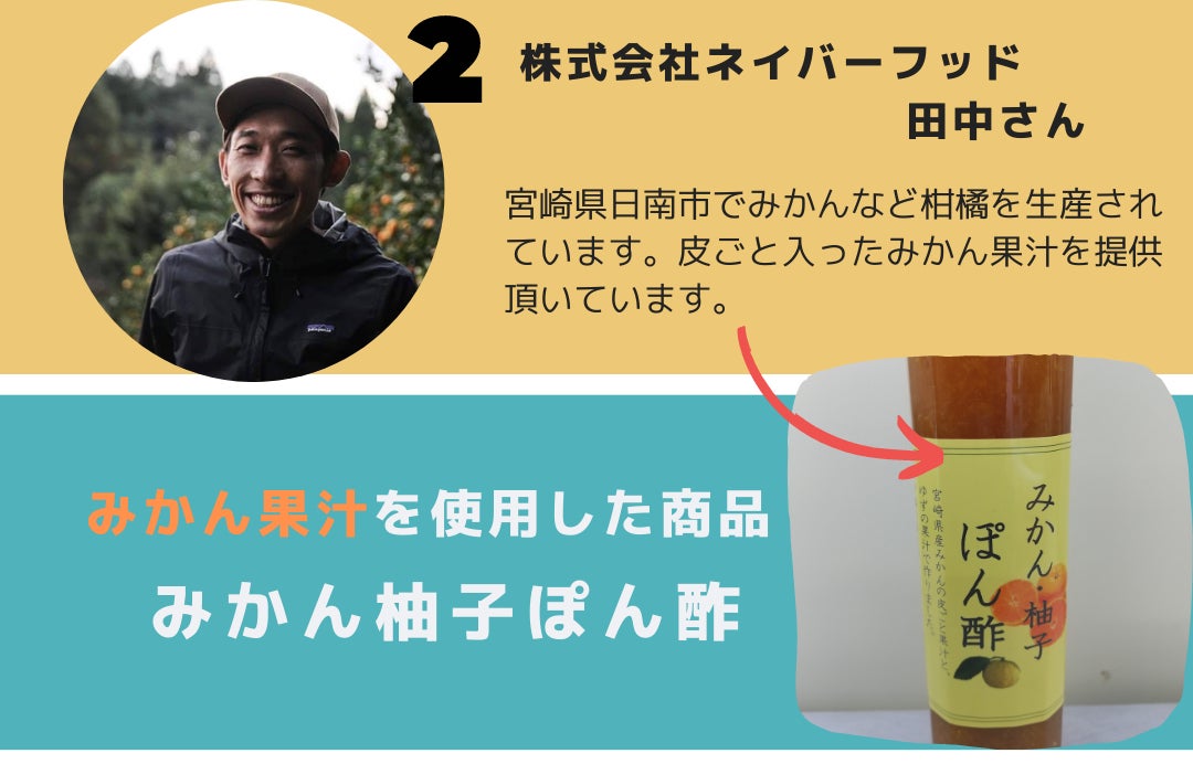 又、私たちは宮崎の生産者と宮崎の農水産物の素晴らしさを多くの方に周知していただく為に日高家に伝わる料理をコンセプトに様々な加工商品を製造しています。今回は宮崎唯一の日本酒蔵元の作る宮崎米を使用した酒粕で甘酒、日南市の太陽をたっぷり浴びたネイバーフッド㈱皮ごと蜜柑果汁と柚子のぽん酢、宮崎産低農薬で栽培された工藤農園の柚子を使用した柚子のお酢煮、祝子農園の生産する延岡藩内藤家七萬石唐辛子を使用した唐辛子酢のセットを作りました。生産者×日高の伝統の味をお楽しみください。