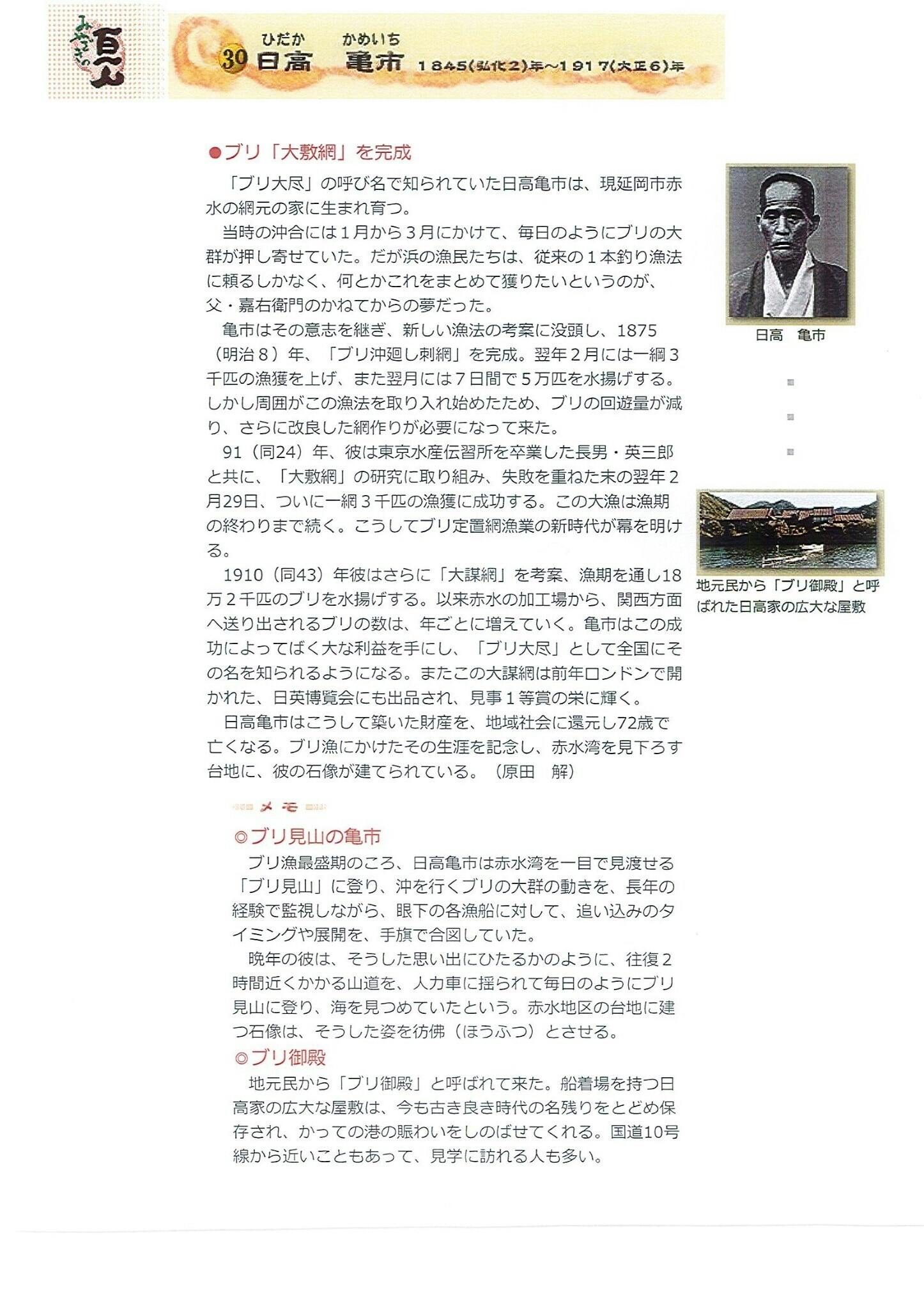 世の中が江戸時代中期の頃「ぶり見山」から見えるぶりの群れをどうしても捕獲したい、という壮大なロマンを追い求め、ぶり大尽の父である喜右衛門 と後にぶり大尽と称される亀市は網の改良に精を出し地元では庄屋職となるなど、それなりの成功を収めても尚、「日向灘に冬から春にかけ群れで来る鰤を捕獲する」という夢を追い続けました。