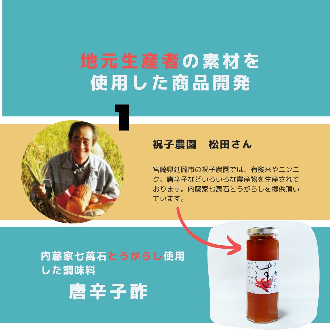 このことを反省し、現在は地元生産者との取組を確固たるものにし、商品開発を行い、宮崎を代表できる商品としてリ・スタートし、販売先を慎重に選んでいくことが、伝統料理を守ることだと認識したからです。
