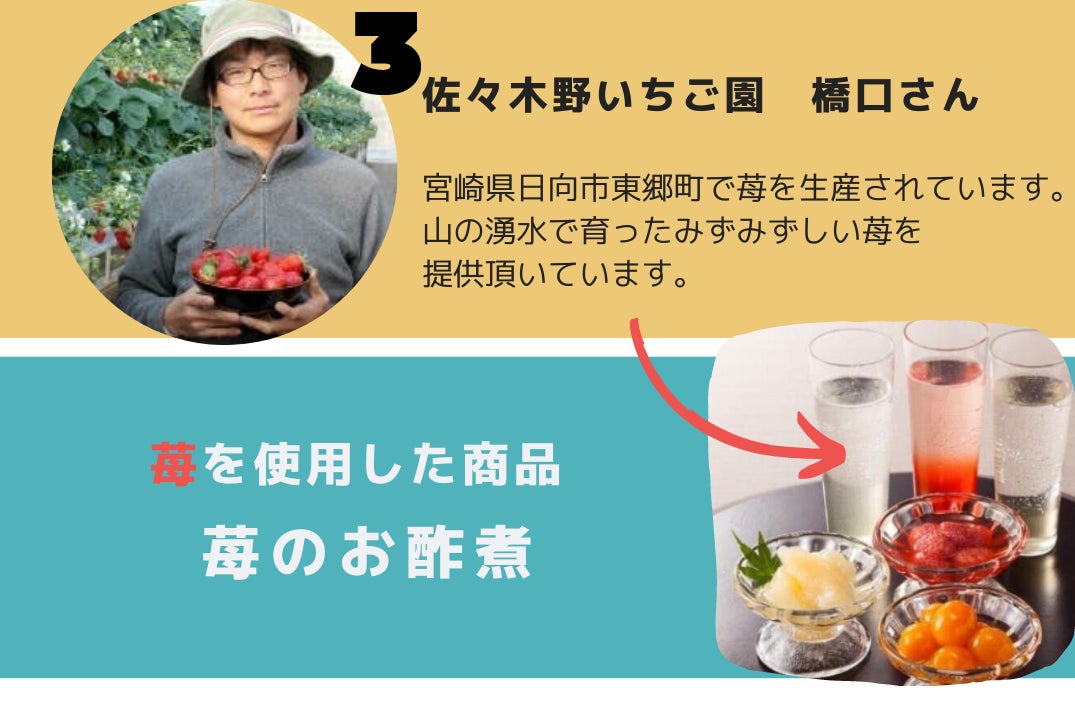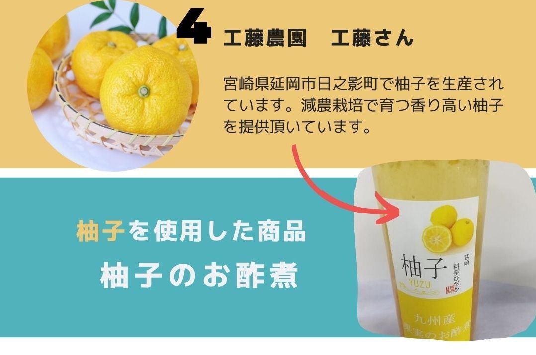 又、私たちは宮崎の生産者と宮崎の農水産物の素晴らしさを多くの方に周知していただく為に日高家に伝わる料理をコンセプトに様々な加工商品を製造しています。今回は宮崎唯一の日本酒蔵元の作る宮崎米を使用した酒粕で甘酒、日南市の太陽をたっぷり浴びたネイバーフッド㈱皮ごと蜜柑果汁と柚子のぽん酢、宮崎産低農薬で栽培された工藤農園の柚子を使用した柚子のお酢煮、祝子農園の生産する延岡藩内藤家七萬石唐辛子を使用した唐辛子酢のセットを作りました。生産者×日高の伝統の味をお楽しみください。