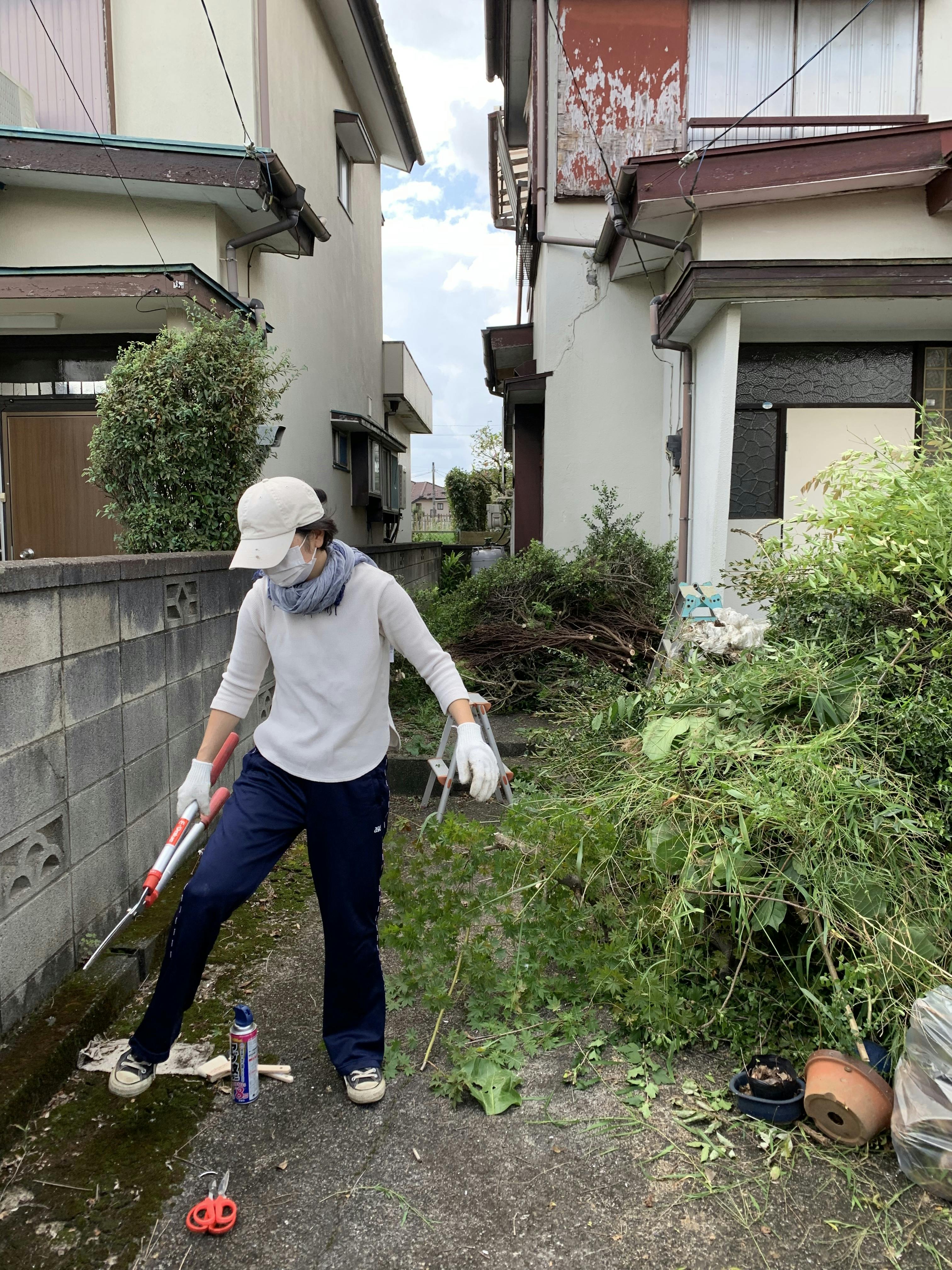 伸び放題だった植物を伐採し、今後外装と内装の作業がしやすくなるように、通路を確保いたしました^ ^