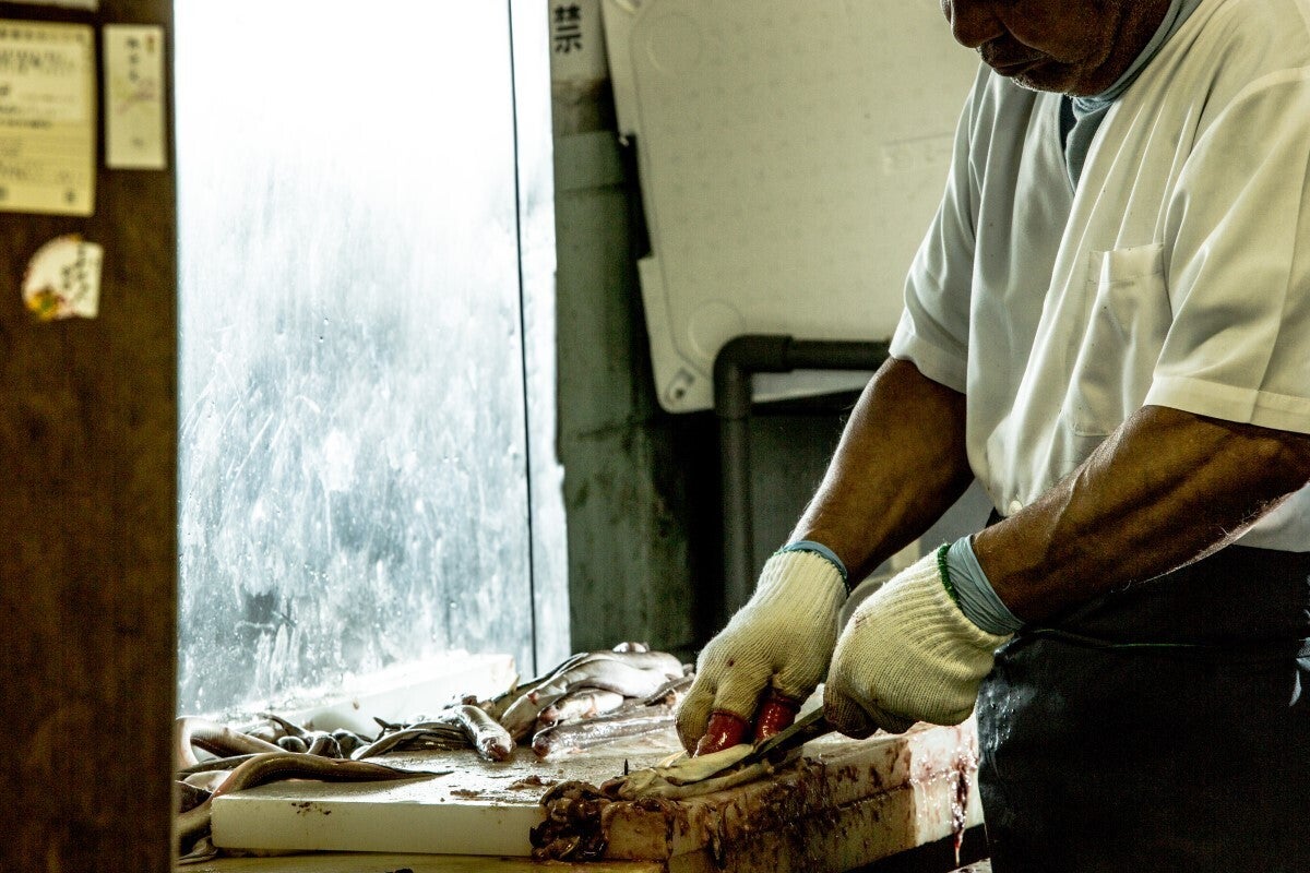 焼穴子は、国産穴子を熟練した職人が捌くところから始まります