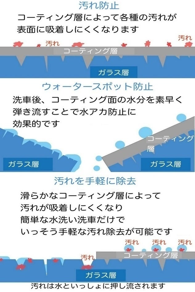 コーティング時は水分が留まりにくくなり、素早く弾き飛ばせるコーティング膜が作られます。
