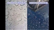 コーティング前・後のガラス表面にできる水滴の違い。コーティング前は水滴が丸くならず、