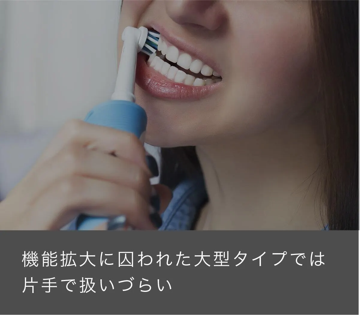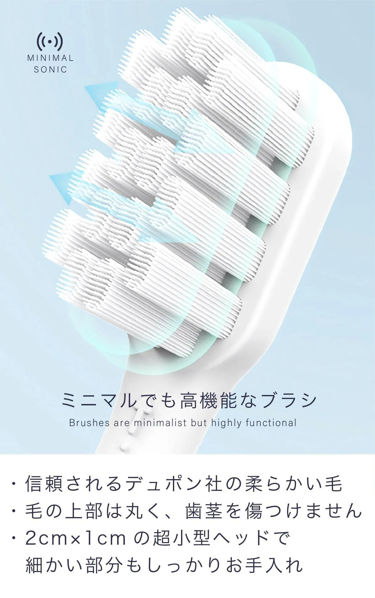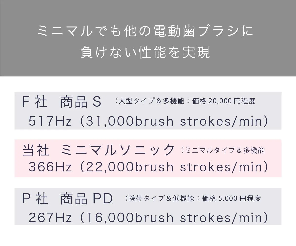 大型だと扱いにくく、ブラシヘッドも大型のため、磨き残しが起きやすいのです。ミニマルソニックは扱いやすく、ブラシヘッドも2cm×1cmと小型なのであらゆる場所が磨きやすいのです。