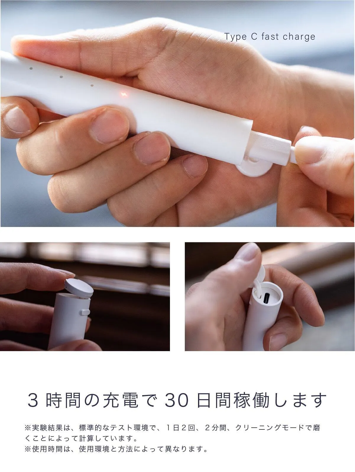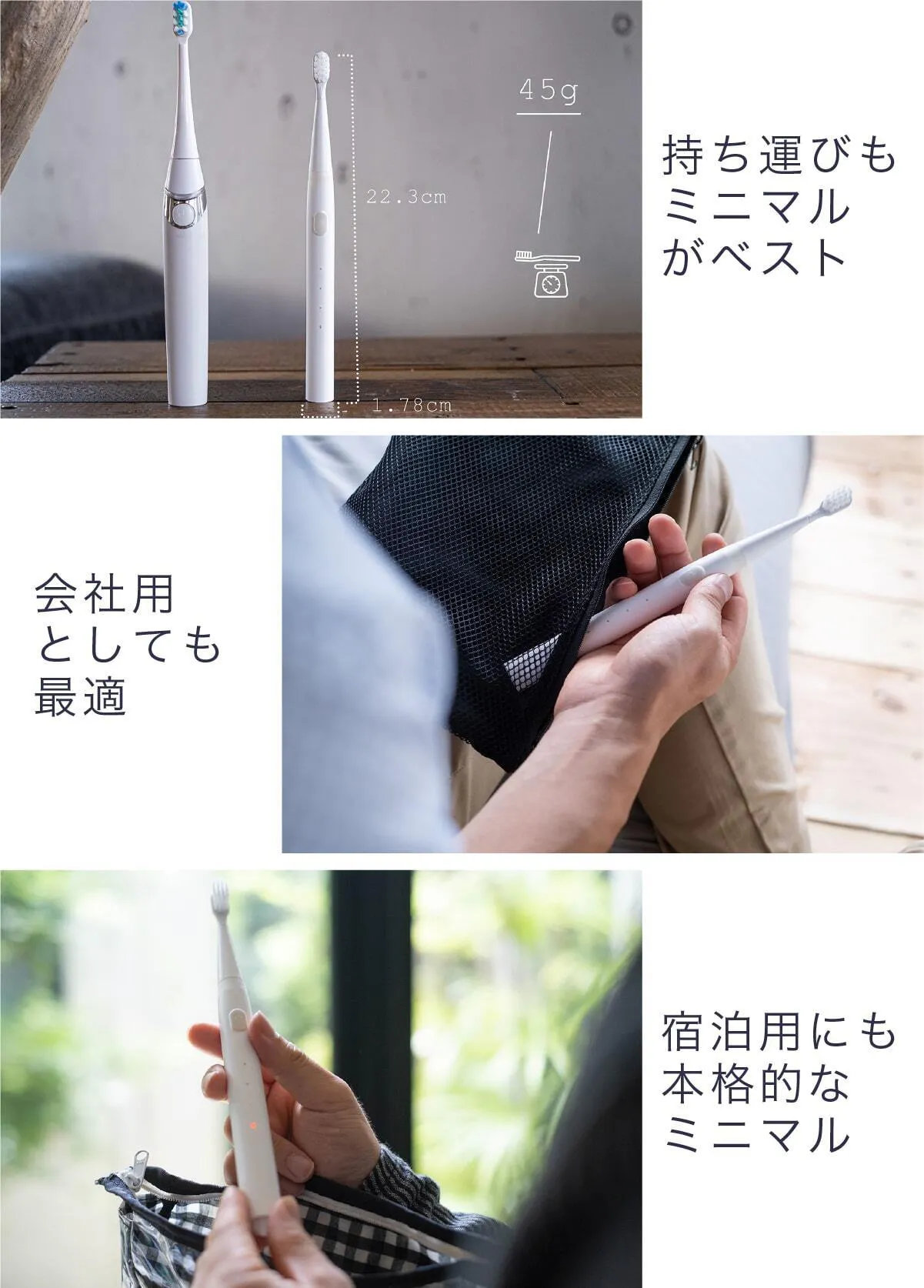 ミニマルサイズだから、持ち運びにも便利です。ポーチに入れて、会社用に宿泊用に。3時間の充電で30日間稼働するので、電源の心配不要です。