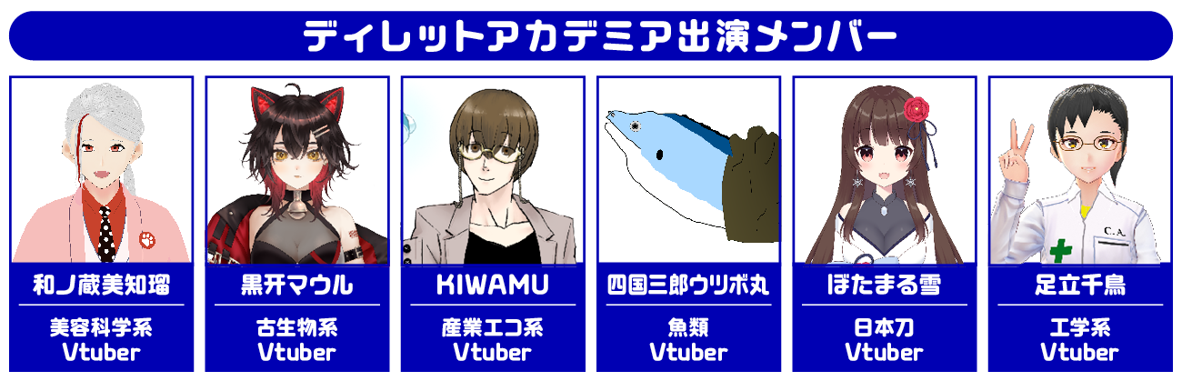 メンバーはそれぞれ研究している分野が好きすぎたり、趣味が高じたりして、自分の好きなこと、知って欲しいことをYouTubeやTwitterなどで発信しているVtuberたちです!