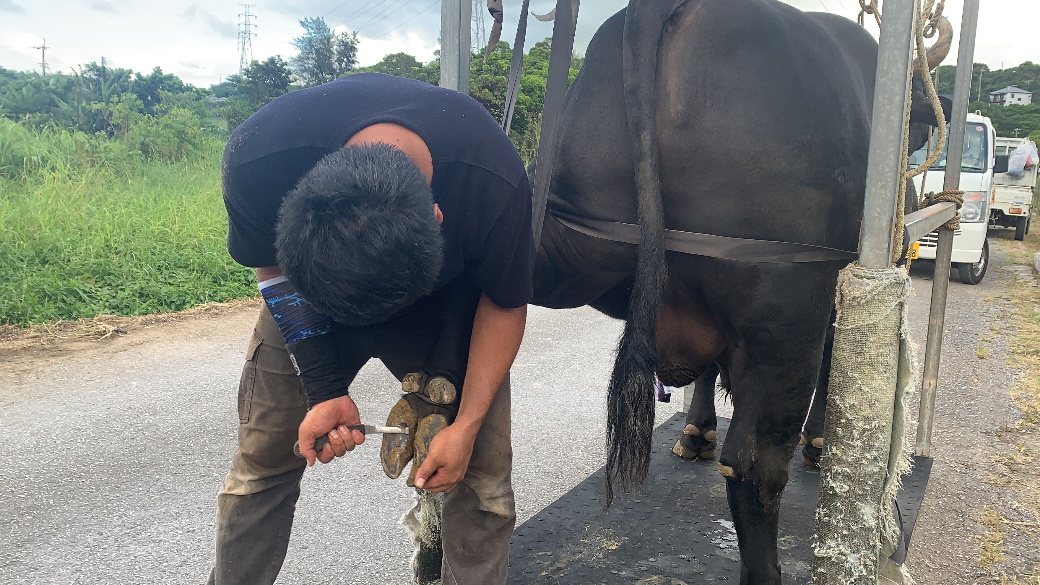 枠場以外にも挙足や治療手法など、これまでの削蹄の常識が通用しない様々な問題が立ちはだかりましたが、沖縄訪問の度に牛主の方々が深夜までアドバイスをくださったり、商売敵にもなり得る私に惜しみなく積み上げてきた技術や知識を教えてくださった現役削蹄師の先輩のご協力を経て少しずつ解決してきました。現在は枠場を除けば自信を持って提供できる削蹄レベルであると自負しています。闘牛削蹄に携わって以来、当初予定よりも随分多く沖縄を訪問しました。「住んでるの?」と言われる事もしばしば。正直、商売としては大赤字の数か月でしたが、課題→改善→検証を繰り返す日々は北海道修行で一部満足し、慢心していた僕自身の削蹄師としての意識と技術を高めるとても貴重な時間となりました。