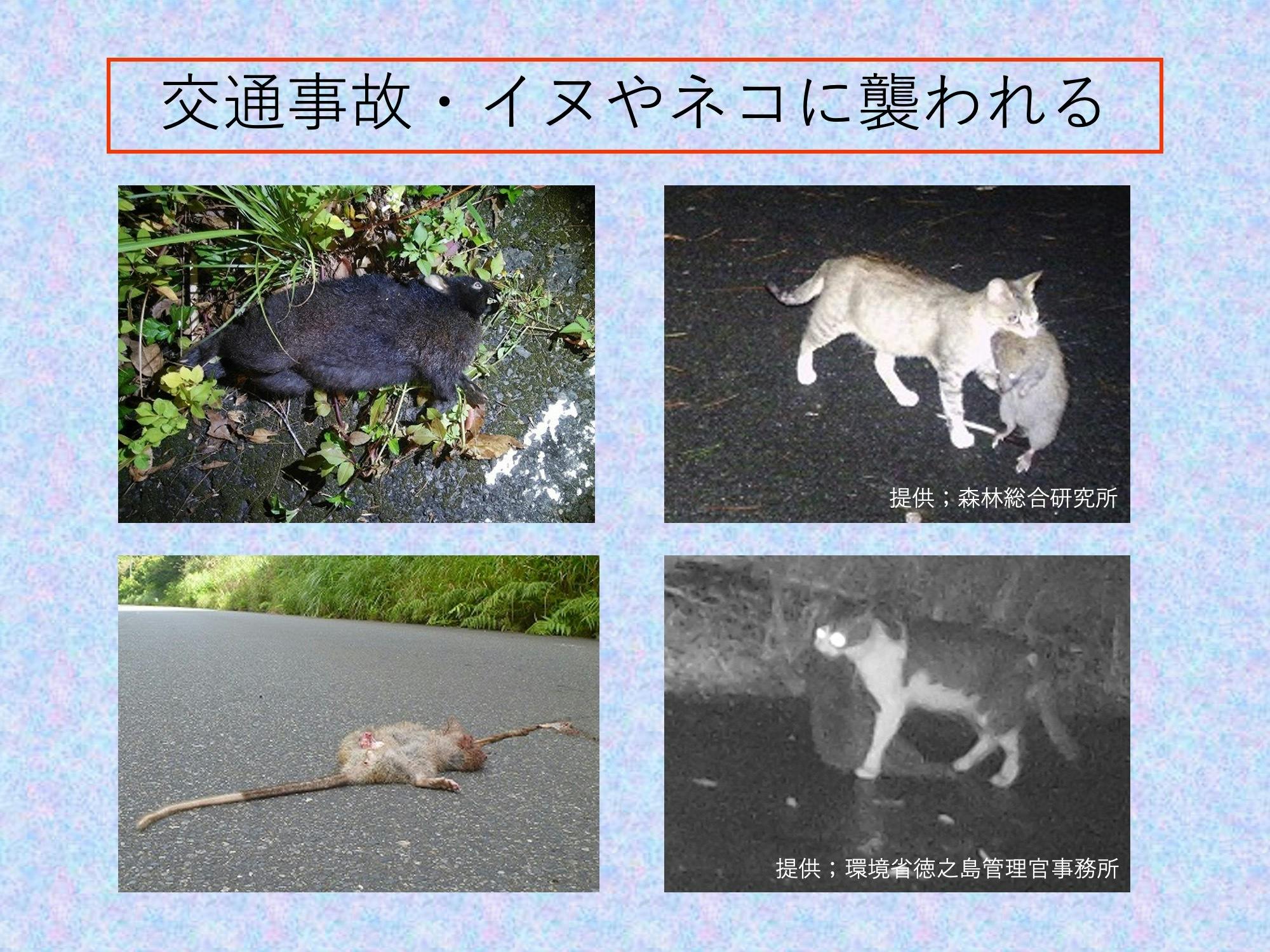 ②農道や林道でアマミノクロウサギの交通事故が絶えない。