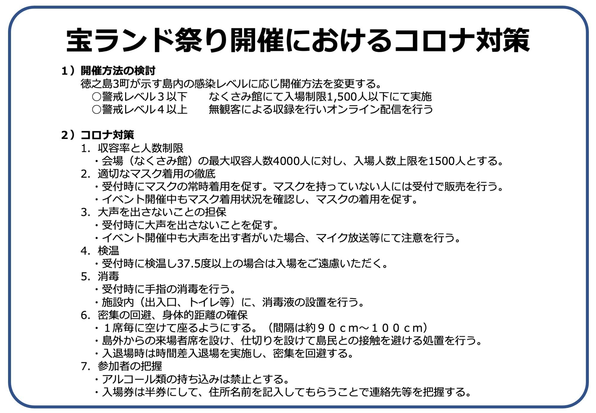 このイベントは単なる世界自然遺産の登録を祝う祭りではなく、世界の宝となった島の自然を100年先、500年先の未来へつなぐという、大きなプロジェクトのスタートラインと考えています。そのためにも、より多くの島民に「この島は私たちが守っていく。」という強い決意をしてもらいたい。だからまずは、このイベント『宝ランド祭り』を大成功させたい。この地球で暮らす未来の子どもたちのためにも。そんな思いを込めたイベントです。