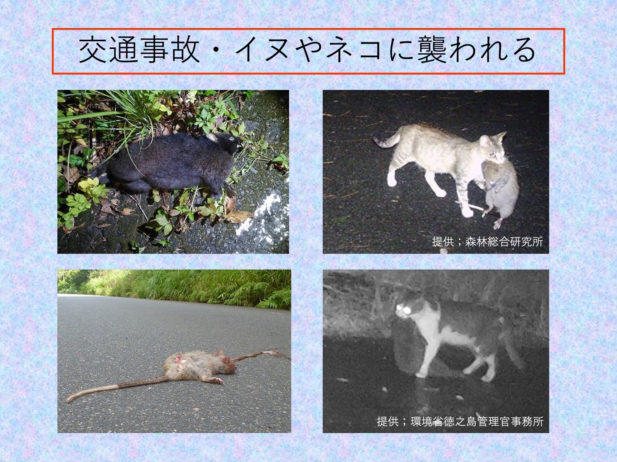 ①放し飼いされているネコやイヌが森に入り希少野生動物を捕食している。