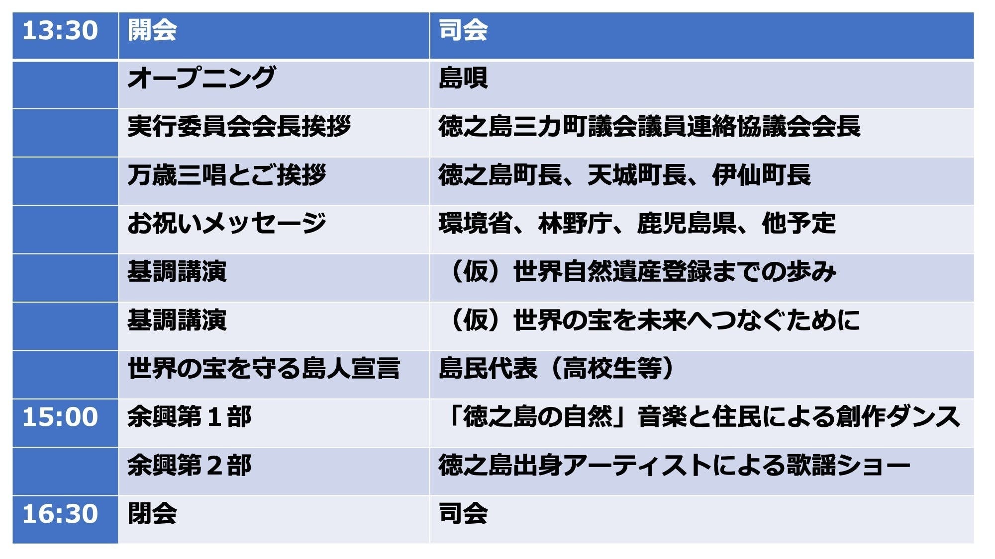 ・式次第・主催者挨拶・関係者のからのお祝いメッセージ・徳之島の希少動植物の写真