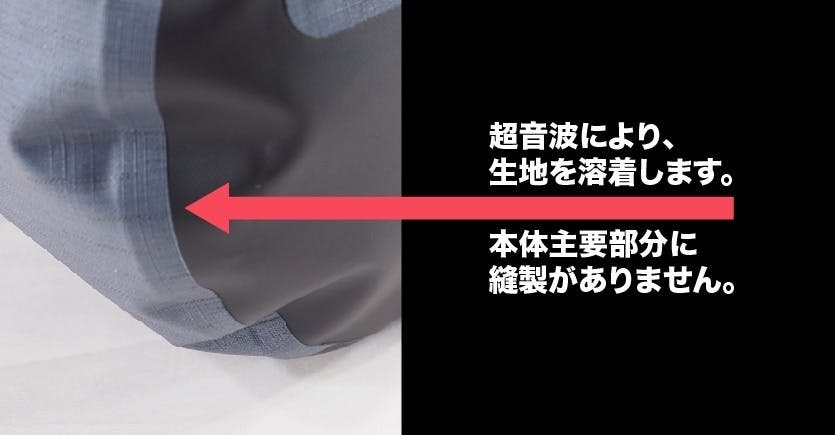 バックのメインボディー部分は気密性を損なわないよう、超音波無縫製製法という生地同士を溶解圧着する特別な方法で作られているので、針と糸による縫製がありません。この製法により防水性を高めています。