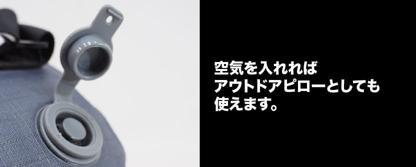 メインコンパートメント外側には本体内部の空気圧を調整するエアバルブが付いています。ワンプッシュで空気を抜いたり、空気を入れば本体をアウトドアピローや浮き具のように膨らますこともできます。