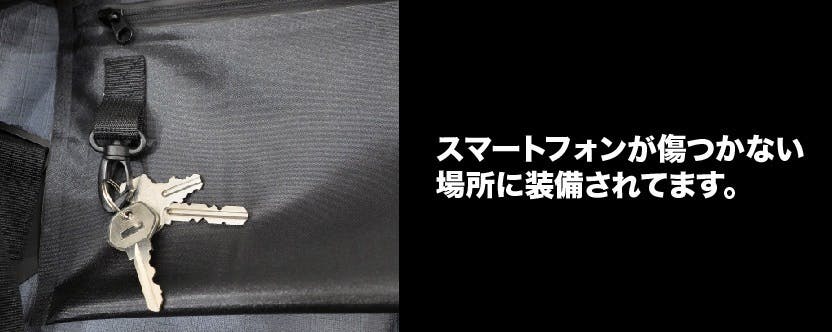 インナーポケット外側にはキーホルダーがついています。鍵は金属製が多いので、インナーポケット内側にあるとスマートフォンを傷つける恐れがあるので外に配置してあります。鍵が所定の場所に収納されていることが安心につながります。