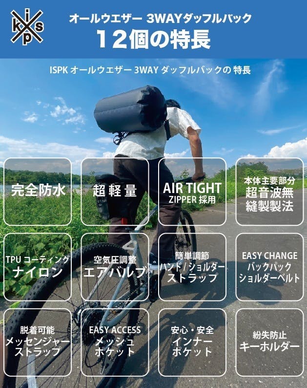 そして、このたび私たちの理想を形にした「オールウエザー3WAYダッフルバック」の発表することになりました。超軽量でありながら災害にも対応する完全防水仕様のこのモデルは、「軽くて使いやすい」と「大切なものを濡らさない完全防水」という2つの安心を兼ね備えた、自然災害時から夏フェスまで使えるとても便利なダッフルバックです。