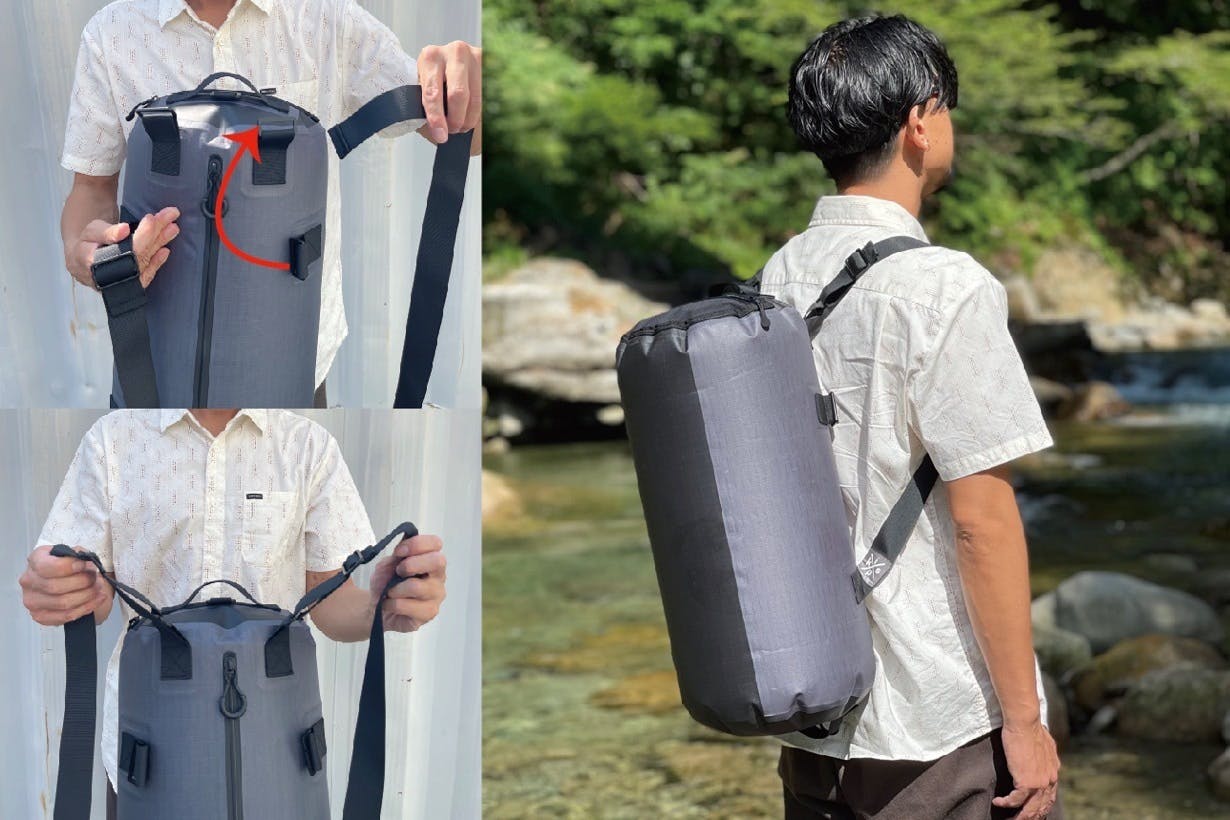 *浮き具としての使用はあくまでも簡易的なもので、バックの防水性効果を謳ったものです。その安全性を保証するものではなく、関連する事故などにおいて当社は一切責任を負えません。ご注意くださいますようお願い申し上げます。