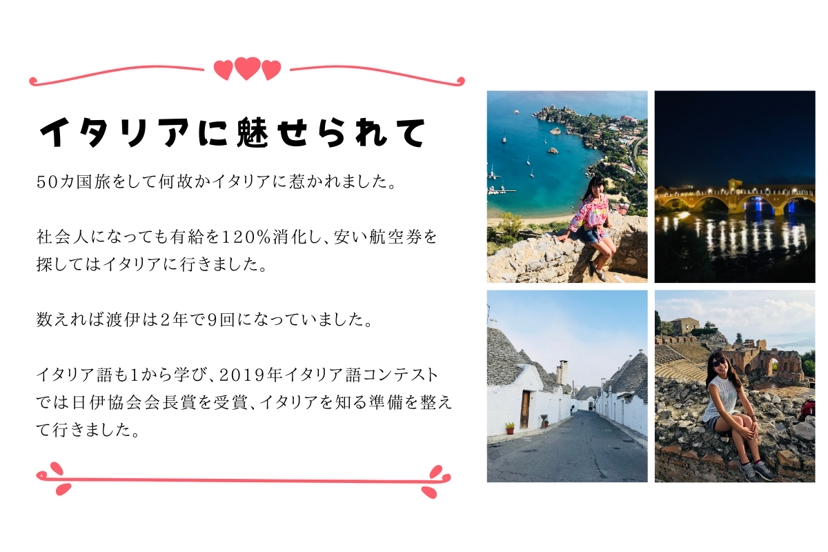 そんな私はこれから、イタリアのボローニャ大学に留学し、世界を舞台に文化を学び、社会の価値を再考する挑戦を始めます。