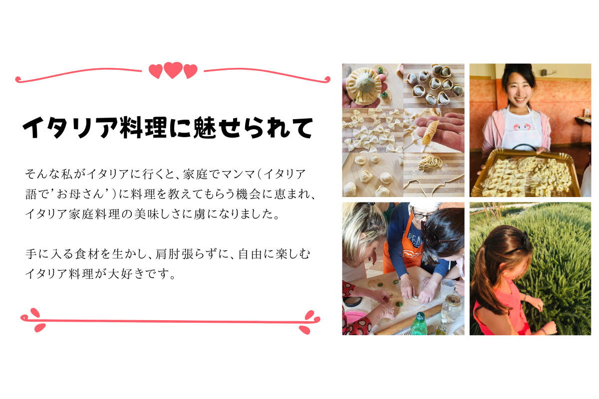 イタリアが大好きで、会社員との複業で、イタリア家庭料理を軸にした仕事を行っています。