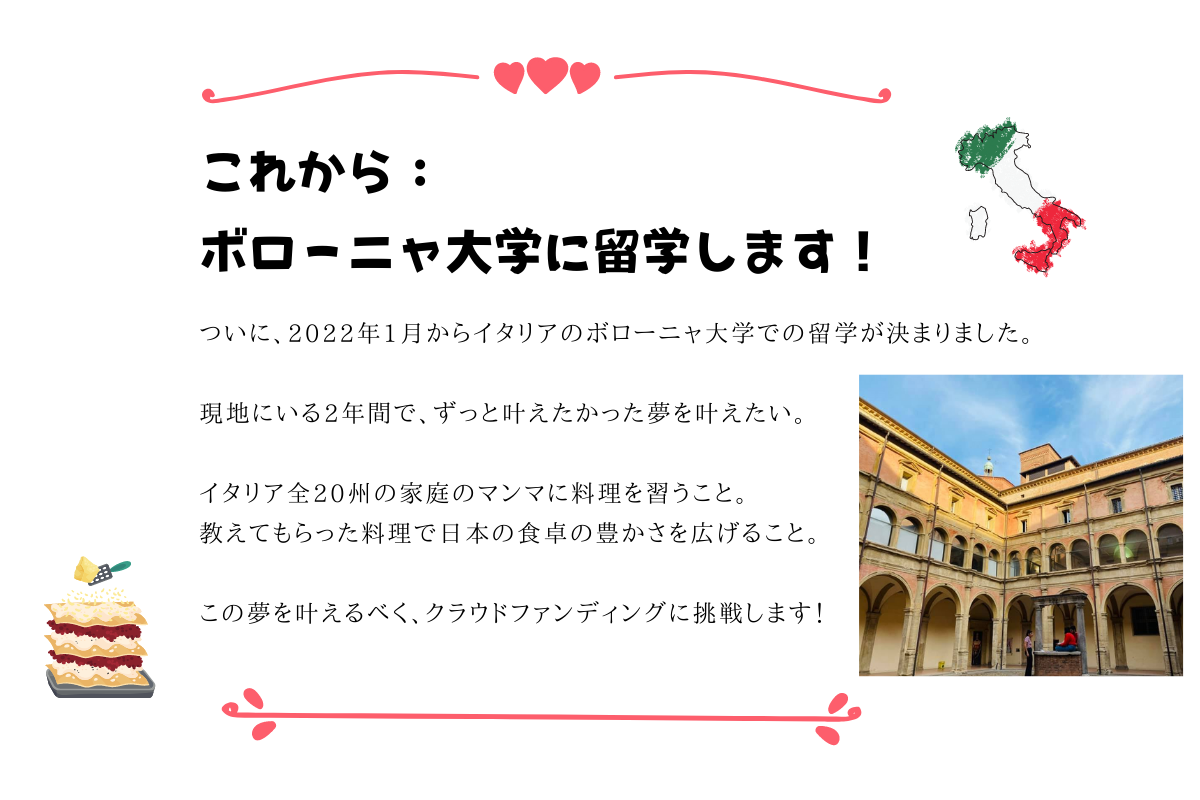 この度、2022年1月からイタリアのボローニャ大学への大学院留学が決まりました。