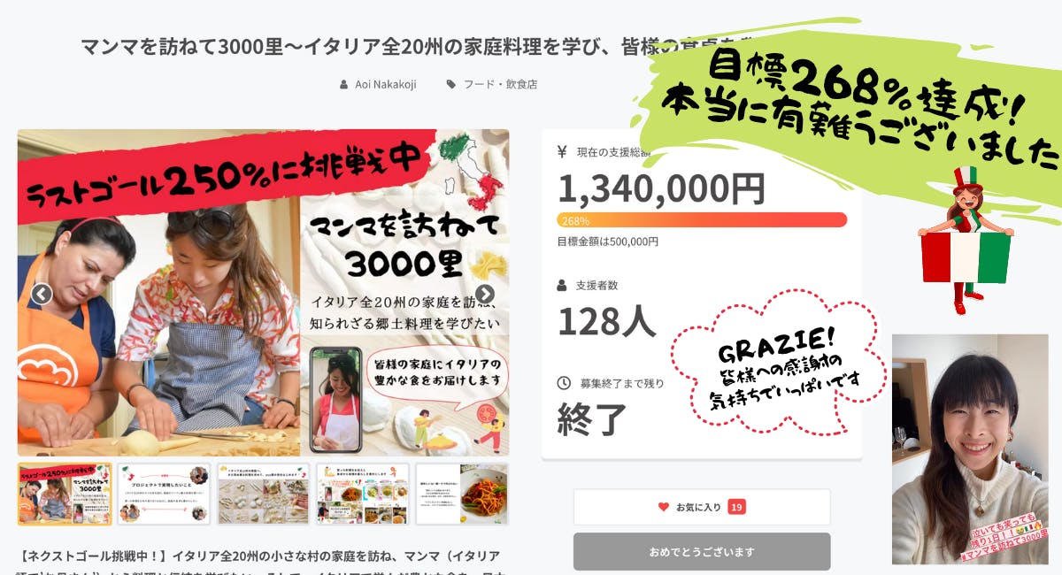 128人の方から134万円のご支援を頂き、268%達成となりました。