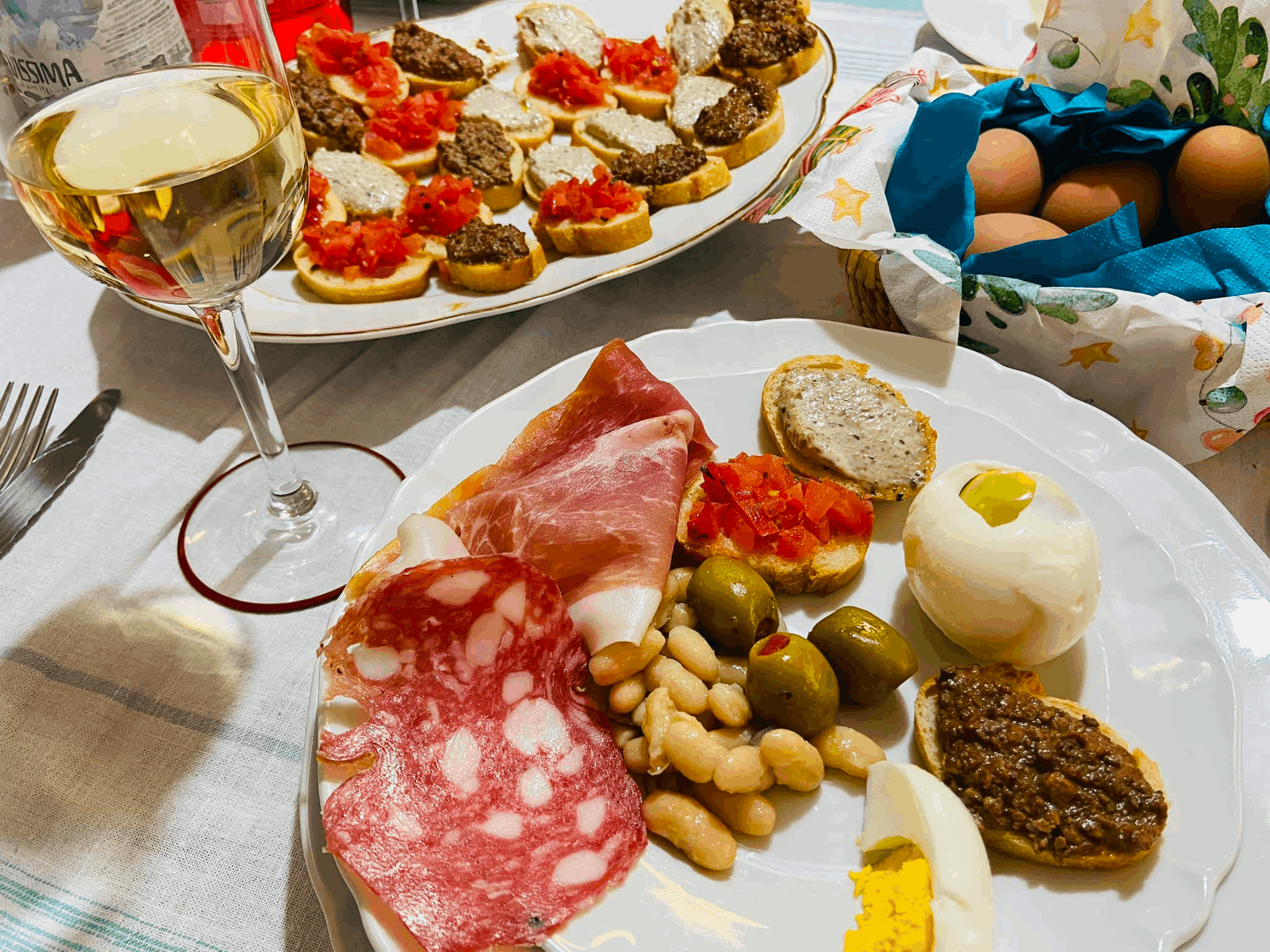 教会でお祈りしてもらった聖なるゆで卵はもちろん、トスカーナらしく、ブルスケッタや、トスカーナ・サラミが並びます。