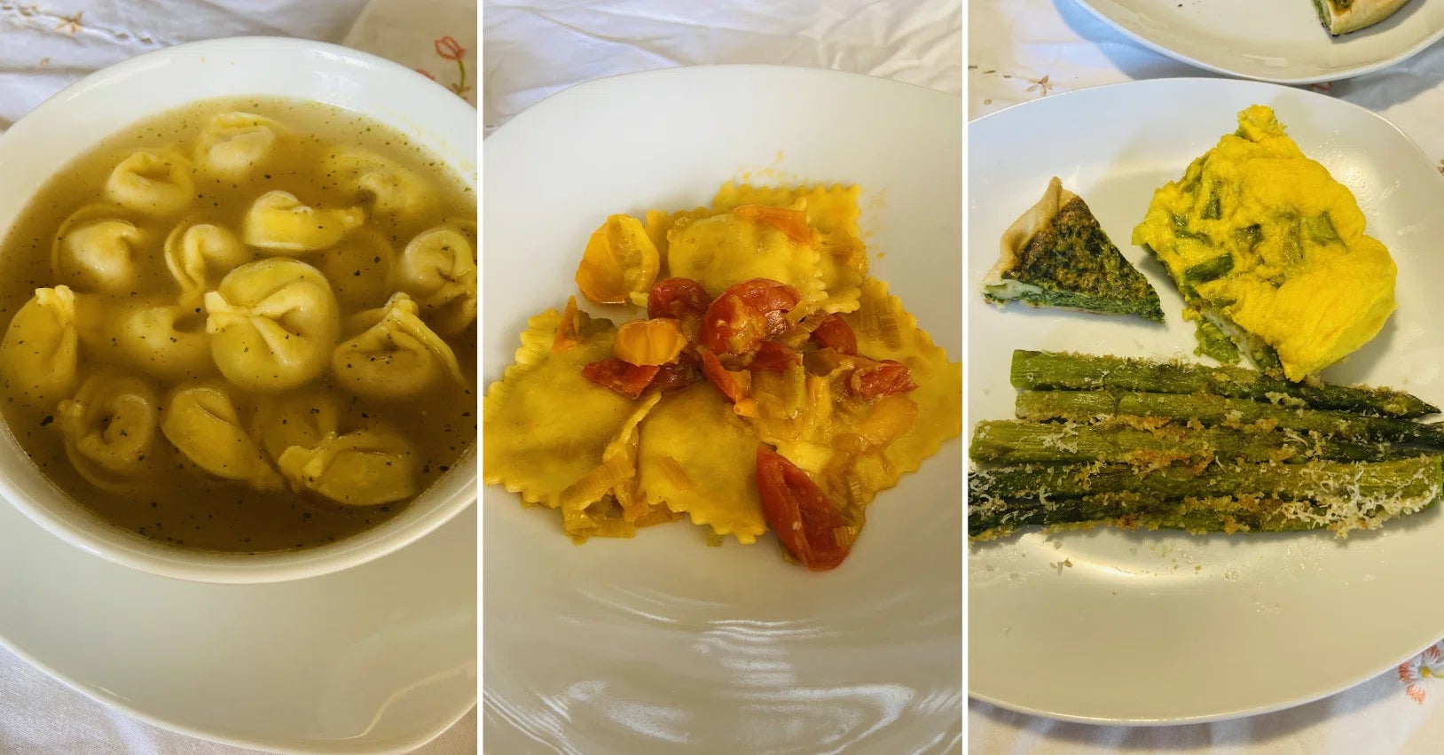 続くパスクエッタ(イースターマンデー)はカペレッティ・イン・ブロードに、リコッタのラビオリ、(少なくとも女性陣は)もう肉は良いやということで、新鮮なアスパラなど春野菜をたっぷり使った料理たち。