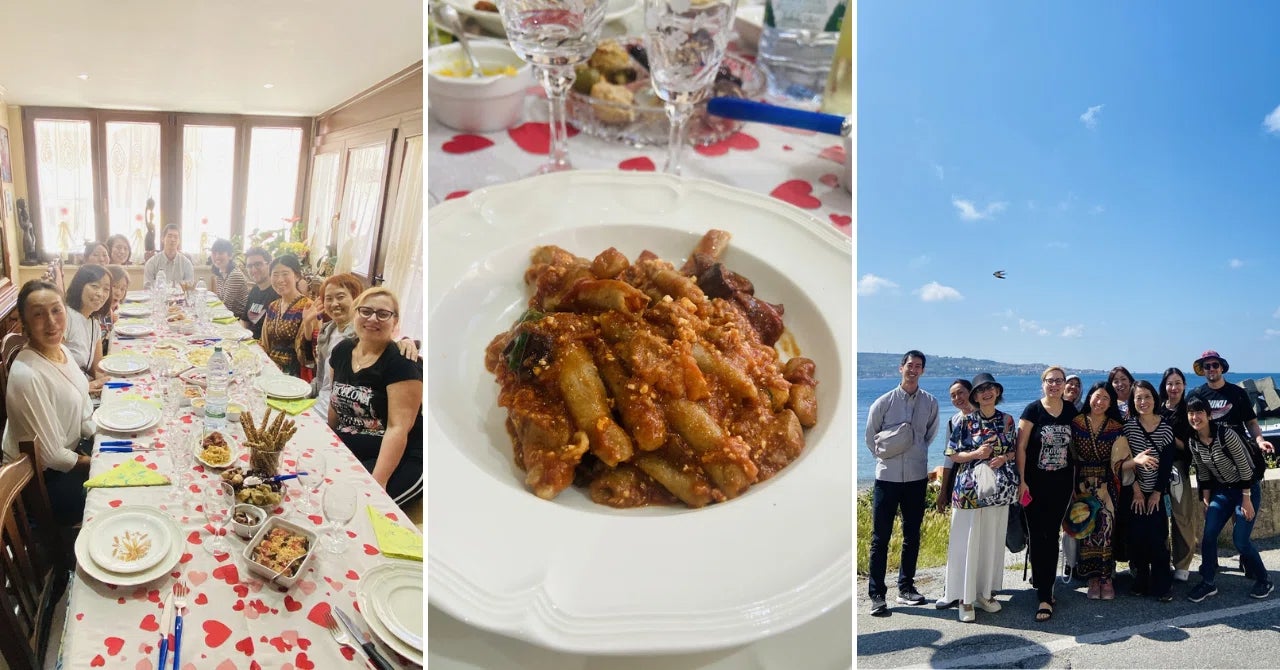 広いバルコニーで朝日を眺めたら、漁師の町のマンマを訪ね、シチリア、メッシーナの郷土料理を習います。手打ちパスタから直伝、メカジキを使った数種類の料理、郷土菓子カンノーリと、作って食べて、楽しみました。